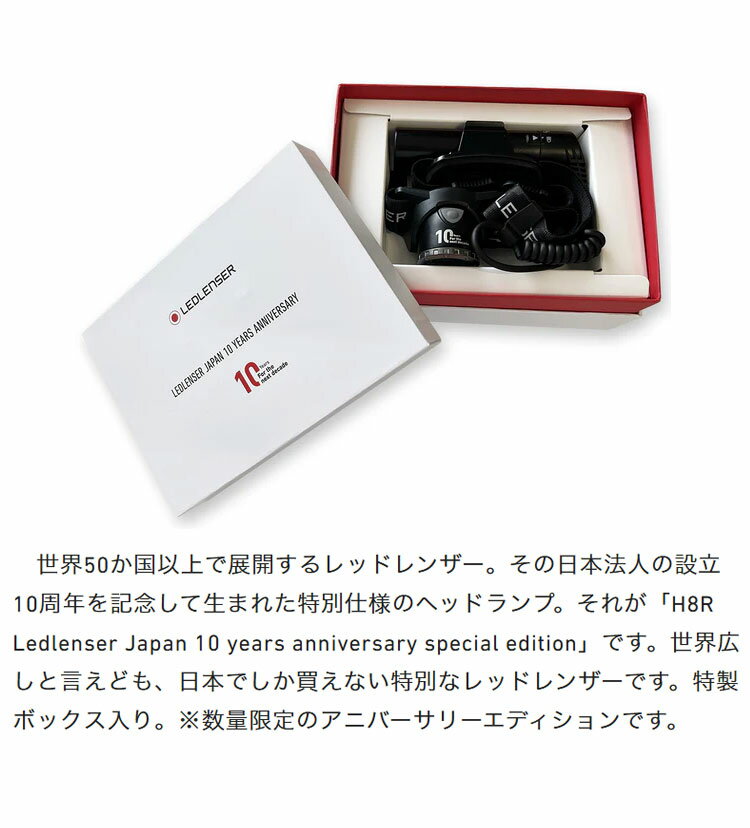 【限定モデル】10周年記念仕様|LEDLENSERH8RAnniversaryEdition往年の銘機「H8R」が特別仕様で復活!長年にわたり支持されてきた名作「H8R」。その完成度はそのままに、記念ロゴをあしらった限定デザインで再登場。プロフェッショナルからアウトドアユーザーまで、あらゆるシーンで愛されてきた実力派モデルが、スペシャルエディションとして登場です。■パフォーマンスはそのまま、信頼のスペックミドルモード:250ルーメンで最大15時間連続点灯軽量設計:約158g(バッテリー含む)フォーカス機能・IP54防塵防滴・2m落下耐性色温度:6000〜8000K、演色評価数:CRI65長時間使用しても首や肩が疲れにくい軽量ボディ。プロユースでも安心のタフな設計。■3種類のヘッドバンド付き!シーンに応じて使い分け可能限定ロゴ入りヘッドバンド 反射素材に記念ロゴを印刷した、視認性とデザイン性を兼ね備えた特別仕様。シリコンヘッドバンド(作業用) ヘルメット装着時にもズレにくく、集中力を妨げないフィット感。現場のプロも納得の安定性。縦型マウントヘッドバンド(ランニング/スポーツ用) ランニング中の“バッテリーの縦揺れ”を最小限に抑える革新構造。2本のバンドでバッテリーをしっかりホールドするこだわり設計。■視界不良時に強い、イエローカラーフィルター付属!白色LEDの弱点である霧や白い息による視界不良を軽減。スキーゴーグルやフォグランプと同じように、黄色フィルターが霧の中でも視界をクリアに保ちます。登山、ランニング、冬季作業に最適なオプションです。■限定モデルだけの「こだわり」が随所に限定ロゴは本体・バッテリーケースの両方に刻印。見る人が見ればわかる、シックで高級感あるデザインに仕上がっています。記念モデルにふさわしい、プレミアムな仕立てです。■10年の感謝を込めてThanksfor10greatyears.Lookingforwardtothejourneyahead.すべてのレッドレンザーファンに向けた特別な1台。職人・プロフェッショナル・トレイルランナー・冒険者…次の10年も、レッドレンザーがあなたの道を力強く照らし続けます。本体寸法(mm):W69×H37×D44(ヘッド部)本体質量(g):約158(電池含)光束(lm):パワー:600/ミドル:250/ロー:10照射距離(m):パワー:150/ミドル:100/ロー:20点灯時間(h):パワー:10/ミドル:15/ロー:120色温度(K):6000〜8000演色評価数(CRI):65ライト機能:パワー、ミドルパワー、ローパワー落下試験(m):2使用電池:専用充電池(Li-ion)充電時間(h):約6充電池電圧(V):3.7充電池容量(mAh):3,000電池の電力量(Wh):11.1保護等級:IP54フォーカス機能:あり主な素材:アルミニウム合金、プラスチック付属品:専用充電池(型番:501001)、USB充電ケーブル、収納ポーチ、シリコンヘッドバンド(黒、作業ヘルメット向け)、縦型バッテリーヘッドバンド(ランニング/スポーツ向け)、イエローカラーフィルター(霧/視界不良時用)保証期間:2年(製品登録で7年に延長)型番:503184EANコード:4058205038898【送料について】北海道、沖縄、離島は送料を頂きます。