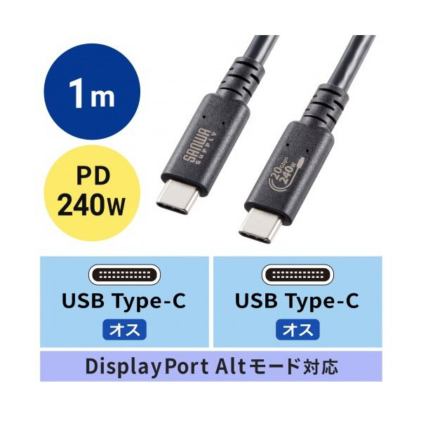 ■商品内容●USBType-Cポートを持つパソコンやタブレット端末などと、USB機器(Type-Cポートを持つ機種)を接続するためのケーブルです。1mのブラックです。●コネクタの表・裏を気にせず使えるUSB Type-Cコネクタを採用しています。●USB IF(USB Implementers Forum)で認証された製品です。●USB 20Gbps(USB4 Gen2×2)の「SuperSpeed+USB(転送速度20Gbps)」に対応した高品質ケーブルです。●USB PD240W(USB Power Delivery EPR)に対応しています。USBPD対応の機器、環境では最大DC48V/5A(240W)の電源供給が可能です。USB Power Delivery最大20V/5A(100W)にも対応しています。●Type-C(DisplayPort Altモード対応)搭載機器と、Type-C(DisplayPortAltモード対応)の入力端子を持つディスプレイを接続して使用することができます。4K60Hz対応です。●ノイズに強い3重シールド構造です。●錆にも強く、経年変化による信号劣化の心配が少ない金メッキ処理を施したピン(コンタクト)を使用しています。■商品スペックコネクタ形状:USB Type-Cコネクタオス-USB Type-Cコネクタオスケーブル長さ:1mケーブルタイプ:CCタイプ規格:SuperSpeed USB 20Gbps・USB4 Gen2×2その他仕様:●ケーブル径:5.0mm●線材規格:UL2725●USB PD(USB Power Delivery):対応(最大PD240W(48V/5A))●重量:約45.1g備考:※供給電源は接続する機器や電源の仕様により異なります。■送料・配送についての注意事項●本商品の出荷目安は【5 - 11営業日 ※土日・祝除く】となります。●お取り寄せ商品のため、稀にご注文入れ違い等により欠品・遅延となる場合がございます。●本商品は仕入元より配送となるため、沖縄・離島への配送はできません。[ KU-20GCCPE10 ]