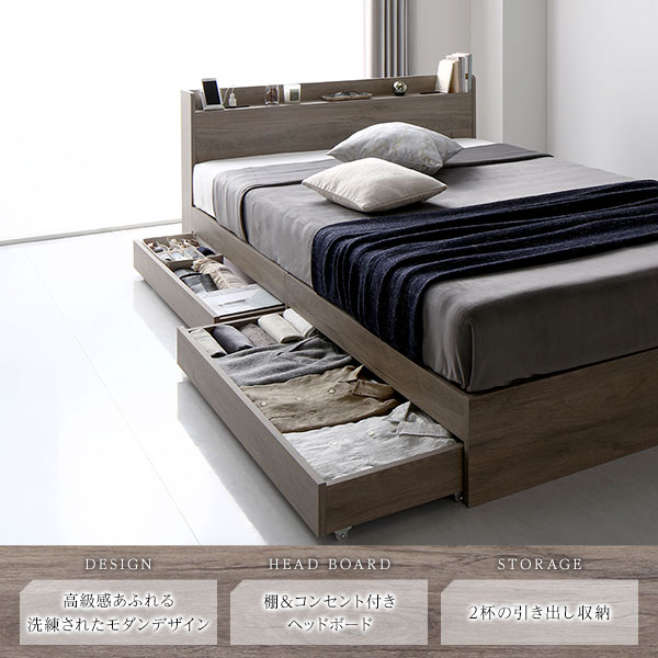 ■サイズ・色違い・関連商品サイズバリエーションシングルベッドセミダブルベッドダブルベッドマットレスセットバリエーション本体フレームのみ本体フレーム+ポケットコイルマットレスセット本体フレーム+ボンネルコイルマットレスセットカラーバリエーションブラックブラウングレージュナチュラルホワイト■商品内容グレイッシュなシンプルモダン収納ベッド・洗練されたシンプルモダンデザイン・棚&コンセント付きのヘッドボード・2杯の引き出し収納付■高級感漂うモダンデザインシンプルで、飽きがこず長く使える洗練されたデザイン・手になじむ形状・ネジ穴が表から見えない構造■洗練されたカラーとリアルな質感グレージュカラー×オーク柄グレーとベージュを掛け合わせたニュアンスのあるカラ—で美しく大胆な柄が魅力のオーク柄を採用・本物のような木の質感 古木風の木目にエンボス加工を施すことで、 まるで天然木のような表情に仕上げました。■棚&コンセント付き本や携帯の充電もすべて枕元に集約できる便利さダブルサイズは左右両側に2口×2つ、それ以外のサイズは右側に2口×1つのコンセント付き。メラミン樹脂加工板とは安価な紙張りの合板よりも水、キズ、汚れに強く、キッチンカウンターの天板などに多く使われる材質です。■キャスター付き2杯収納左右どちらにも取り付け可能な引き出し収納付き・引き出しの反対側は大きなフリースペース■湿気に強く、カビにくい床板と引き出し床板に化粧を施し、いつでも清潔※床板の桟に緩衝シール付■耐荷重200kgの頑丈構造クロス構造と金属プレートで抜群の耐荷重※各フレームは金具で固定※クロス構造はダブル、セミダブルサイズのみ。※シングルサイズの耐荷重は120kg。■簡単組み立て(1)ヘッドボードを組み立てる。(2)完成したヘッドボードを設置。(3)サイドフレームとミドルボードを取り付ける。(4)サイドフレームとフットボードを取り付ける。(5)引き出しを設置。※引き出しは組み立て式です。(6)床板を設置して完成。【マットレスセットもご用意】 1年保証 1 Year Warranty 2層ポケットコイルマットレス 高級ホテルのような寝心地のよさを ポケットコイルを2層仕様にし、贅沢な寝心地を実現しました。 日本製ポケットコイルマットレス 日本人のための確かな睡眠と品質を 国内最高クラスのスプリングを使用。 防ダニ・抗菌・防臭機能付き。両面仕様。 快眠ポケットコイルマットレス 独立したコイルが身体に沿ってフィット 袋に包まれたコイルが独立して沈み込むため、 身体のラインに沿い自然な寝姿勢を保つ体圧分散構造。 波動が伝わりにくく二人でのご使用にもおススメです。 快眠ボンネルコイルマットレス 身体を面でしっかり支えるボンネルコイル 連結されたコイルが身体を面で支えるため、 弾力性が高く、安定性、耐久性に優れています。 また、通気性がよくムレにくく快適です。※ご注意事項 ベッドフレームには必ずスプリングマットレスを乗せてご使用ください。 布団や薄型のマットレスのみの使用等でご使用いただいた場合、 状況によっては商品の破損を招く可能性がございます。■商品スペック【ベッドフレーム本体】 ■サイズ シングル:(約)幅97×長さ210×高さ69cm セミダブル:(約)幅120×長さ210×高さ69cm ダブル:(約)幅140×長さ210×高さ69cm 床板までの高さ:(約)24cm 引き出し有効内寸:(約)横92×奥行37×高さ8cm ■材質 合成樹脂化粧パーティクルボード ■カラー グレージュ ■機能 シングル、セミダブル:2口コンセント(1500W) ダブル:2口コンセント(1500W)×2 コンセントコード長さ:約1.8m ■品質保証 1年間 ■生産国 中国 ■梱包サイズ 梱包数:3 シングル:(約)101×27×14cm、100×43×12cm、97×49×12cm セミダブル:(約)122×27×14cm、100×43×12cm、61×49×21cm ダブル:(約)144×27×14cm、100×43×12cm、74×49×21cm ※各サイズは概算です。 ■商品に関するご注意 ・この商品はスプリングマットレスの使用を前提に設計されています。 床板の上に直接乗ったり、薄手のマットレスや布団で使用すると、 床板が破損する恐れがあります。 ・写真の色調はモニターの機種や設定により実際の商品と異なる場合があります。 ・本製品はお客様組立品です。プラスドライバーをご用意ください。 ‐2人以上での組み立てをおすすめします。 ‐商品の組み立て開始前に部材不足、破損がないか必ずご確認ください。 ‐ネジは最初から強く締めず、仮止めで組み立ててから最後に増し締めしてください。 ・商品写真はダブルサイズ、厚さ15cm前後のマットレスを使用しています。(一部の写真を除く) 実際の大きさはスペックをご確認ください。 ・製造の都合上、粉塵のようなものが付着している場合がございます。 人体に影響のあるものではございませんが、気になる場合は乾いた雑巾等で 乾拭きをしてご使用下さい。 ・付属している緩衝シールは使用を続けると劣化します。 市販のフェルトなどに交換をしてください。 ※イメージ画像はボンネルコイルマットレスを