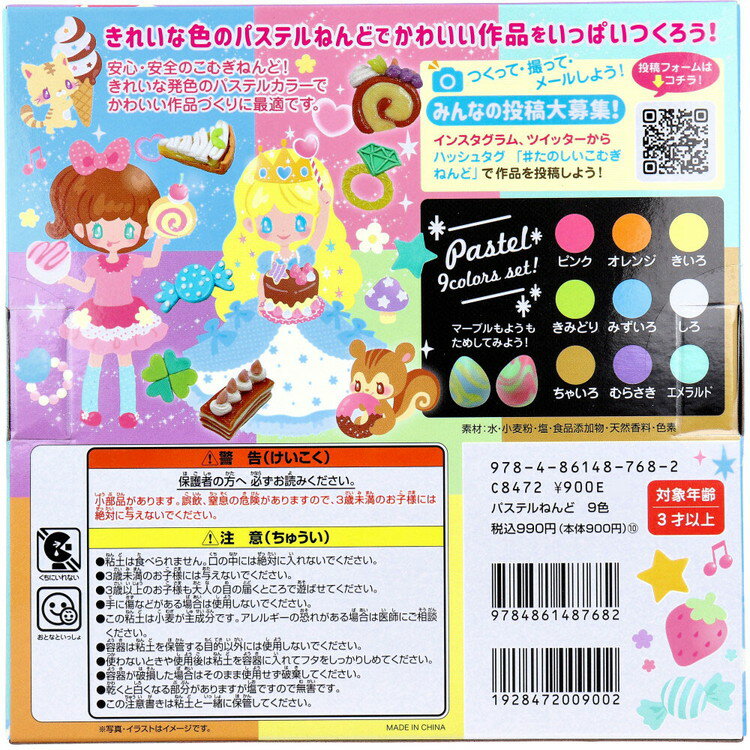 【商品特徴】【セット内容】こむぎねんど 35g×9色(ピンク、オレンジ、黄、黄緑、水色、白、茶色、紫、エメラルド)【材質】水・小麦粉・塩・食品添加物・天然香料・色素【対象年齢】3歳以上【商品詳細】きれいなパステルカラーでこねて、まぜてかわいい作品をいろいろ作ろう!●原料が小麦粉、水、塩なので、安心、安全です。●ねんどがベタベタしない!●色がキレイなパステルカラー♪●ねんどが柔らかくて作りやすい!●キレイな色でかわいい作品に最適!●創造力と思考力ねんど遊びを通じて自分で考えて作る力を育てます。●色彩感覚いろいろな色を使い、混ぜることにより養われます。●脳の発達指先を動かすことで脳の発達を促します。【注意】★警告※保護者の方へ必ずお読みください。・小部品があります。誤飲・窒息の危険がありますので、3歳未満のお子様には絶対に与えないでください。★注意・粘土は食べられません。口の中には絶対に入れないでください。・3歳未満のお子様には与えないでください。3歳以上のお子様も大人の目の届く所で遊ばせてください。・手に傷などがある場合は使用しないでください。・この粘土は小麦が主成分です。アレルギーの恐れがある場合は医師にご相談ください。・容器は粘土を保管する目的以外には使用しないでください。・使わないときや使用後は粘土を容器に入れてフタをしっかりしめてください。・容器が破損した場合はそのまま使用せず破棄してください。・乾くと白くなる部分がありますが塩ですので無害です。・注意書きは粘土と一緒に保管してください。個装サイズ:182X182X45mm個装重量:約485g内容量:14色製造国:中国【発売元:株式会社シルバーバック】※メーカーの都合によりパッケージ、内容等が変更される場合がございます。当店はメーカーコード(JANコード)で管理をしている為それに伴う返品、返金等の対応は受け付けておりませんのでご了承の上お買い求めください。【送料について】北海道、沖縄、離島は送料を頂きます。