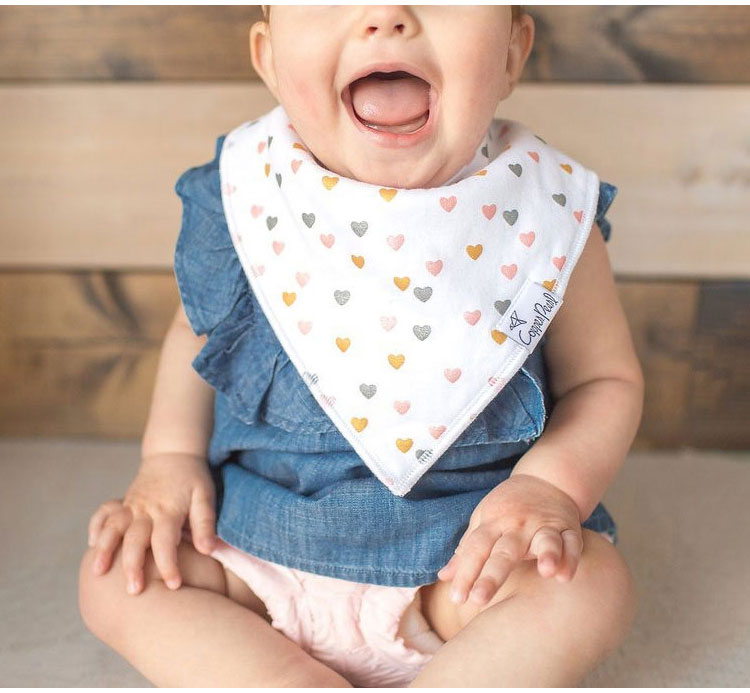 ●6枚セットで毎日がおしゃれにキマるアメリカ生まれのベビー用品ブランド「コッパーパール」から届いたオシャレなよだれかけ『バンダナビブ6枚セット』。最先端の流行を取り入れたオリジナルデザインの生地は、何にでも合わせ易く、どんなスタイルにもベストな仕上げのワンポイントになってくれます。吸水速乾に優れているからよだれの多いベビーでも安心です。しかも洗い替えにもウレシイ6枚セット。ベビーギフトにもぴったりです。●子どもっぽくないモダンなデザインコッパーパールのビブセットの注目すべきは豊富な柄のバリエーションにあります。新作デザインが常に発売し続けられており、最新トレンドのデザインからお選びいただけます。多様な価値観をもつ社会を生きる現代のベビーにぴったりなお気に入りのデザインをきっとみつけられるはずです。●洋服が濡れにくい2枚仕立てスタイリッシュなデザインの表地(綿)と吸水性と速乾性に優れた白い裏地(ポリエステル)の2枚仕立て。表地がキャッチしたよだれの水分を裏地が吸い込み、毛細管現象によって素早く裏地の全面に広げます。それによって水分と空気が触れる面積を広くして速乾を実現。ポリエステルは毛細管現象による浸透速度が速いので、バンダナビブの裏地はいつもサラサラです。よだれの多いベビーでもお洋服が濡れにくいのはそのような仕組みなのです。●フィットしてよだれをキャッチ首元の表地を3cmほど立ち上がるようにデザイン。首やあごに程よく立体的にフィットしよだれをキャッチします。●スナップボタンでサイズ調節サイズ調節は左右に2つずつついたニッケルフリーのスナップ。このスナップは、ベビーにはなかなか外せませんが、大人には簡単に付け外しができます。●ファッショナブルなベビーギフト6枚セットになったバンダナビブは出産祝いにぴったりです。また、クリスマスやこどもの日にプレゼントすればベビーがもっとファッショナブルに!【お手入れ方法】洗濯機可■適応年齢生後0カ月〜3歳頃■パッケージサイズ/重量(約)(約)幅240×高さ230×奥行40mm/(約)141g■本体サイズ/重量(約)(1枚あたり)横幅350mm×縦290mm/(約)20g■素材(表地)綿(裏地)ポリエステル■生産国インド■注意事項※輸入品の為、予告無くパッケージや仕様が変更される場合がございます。予めご了承下さい。【代引きについて】こちらの商品は、代引きでの出荷は受け付けておりません。【送料について】北海道、沖縄、離島は送料を頂きます。Copper Pearl バンダナビブ6枚セットアメリアヘンリーソフィーサニーホーク