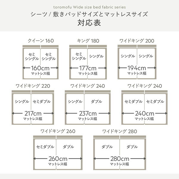 ■サイズ・色違い・関連商品関連商品の検索結果一覧はこちら■商品スペック■サイズ(約)・枕カバー 45×90cm(43×63cmの枕用)・敷きパッド シングル:100×200cm セミダブル:120×200cm ダブル:140×200cm クイーン:160×200cm キング:180×200cm ワイドキング200:200×200cm ワイドキング220:220×200cm ワイドキング240:240×200cm ワイドキング260:260×200cm ワイドキング280:280×200cm・ボックスシーツ シングル:100×200×高さ30cm セミダブル:120×200×高さ30cm ダブル:140×200×高さ30cm クイーン:160×200×高さ30cm キング:180×200×高さ30cm ワイドキング200:200×200×高さ30cm ワイドキング220:220×200×高さ30cm ワイドキング240:240×200×高さ30cm ワイドキング260:260×200×高さ30cm ワイドキング280:280×200×高さ30cm■セット内容・ボックスシーツ + 枕カバーセット ワイドキング200〜ワイドキング280:ボックスシーツ(1枚) + 枕カバー(2枚) 3点セット・敷きパッド + 枕カバーセット ワイドキング200〜ワイドキング280:敷きパッド(1枚) + 枕カバー(2枚) 3点セット■素材・枕カバー 表生地:フランネル ポリエステル100%(静電気防止・抗菌防臭) 裏生地:フランネル ポリエステル100%(静電気防止・抗菌防臭)・敷きパッド 表生地:フランネル ポリエステル100%(静電気防止・抗菌防臭) 中綿:ポリエステル70%、レーヨン30%(吸湿発熱) 裏生地:フランネル ポリエステル100%(静電気防止・抗菌防臭) パイピング:ポリエステル100%・ボックスシーツ 表生地:フランネル ポリエステル100%(静電気防止・抗菌防臭) 中綿:ポリエステル70%、レーヨン30%(吸湿発熱) 裏生地:フランネル ポリエステル100%(静電気防止・抗菌防臭)■カラー・枕カバー、敷きパッド、ボックスシーツ ベージュ、グレージュ、チャコールグレー■生産国中国■梱包サイズ・重量(約)・枕カバー 17×23×5cm・0.23kg・敷きパッド シングル:34×29×14cm・0.92kg セミダブル:34×29×18cm・1.14kg ダブル:34×29×18cm・1.33kg クイーン:37×29×21cm・1.52kg キング:37×29×21cm・1.71kg ワイドキング200:37×29×24cm・1.9kg ワイドキング220:37×31×24cm・2.09kg ワイドキング240:37×33×24cm・2.28kg ワイドキング260:37×37×24cm・2.47kg ワイドキング280:39×37×24cm・2.66kg・ボックスシーツ シングル:38×41×12cm・1.39kg セミダブル:38×41×14cm・1.64kg ダブル:38×41×16cm・1.85kg クイーン:38×44×16cm・2.06kg キング:38×44×17cm・2.27kg ワイドキング200:38×44×17cm・2.48kg ワイドキング220:38×44×18cm・2.69kg ワイドキング240:40×46×18cm・2.9kg ワイドキング260:40×46×19cm・3.12kg ワイドキング280:40×46×22cm・3.33kg【商品に関するご注意】※こちらは『ボックスシーツ単品』の販売ページです。掛け布団カバー、敷きパッド、枕カバー、ブランケット等は付属しません。※本商品は、カバーやシーツのみのお届けとなります。ベッドフレームや枕、マットレス本体は別売りです。※ベージュ×グレージュはシングル・ダブルサイズのみのお取り扱いです。※枕カバー、敷きパッド、ボックスシーツ、ブランケットはベージュ×グレージュの展開がございません。・洗濯の際には、洗濯表示にしたがってお手入れをお願いいたします。・家庭でのご使用を目的としています。業務用でご使用しないでください。・画像や商品情報には、色違いやサイズ・セット違いの商品が載っている場合がございます。ご注文前に色・サイズ・セット内容のご確認をお願いいたします。・写真の色調はモニターの機種や設定により実際の商品と異なる場合があります。・製品のデザイン・仕様・梱包は予告なく変更することがございます。あらかじめご了承ください。【保証期間及び保証内容】・保証期間:購入日から1年間対応。・保証内容:「取扱説明書(同梱)」に従った通常使用の範囲内で起こった 不良品についてのみ、メーカーの判断に基づき良品交換対応をさせていただきます。 ※誤使用や通常使用の範囲外で発生した破損・傷・汚れや、お客様都合による返品交換は致しかねます。 ※保証は日本国内においてのみ有効です。 ※業務用に利用された場合、保証の対象外となります。【配送上のご注意】・本商品は、北海道・沖縄県・離島へ配送できない場合がございます。あらかじめご了承ください。・本商品は、配送希望日と時間帯をご指定可能です。・配送希望日は出荷目安(最長)の 2 - 30 日後の間でご指定ください。・最短でのお届けをご希望の場合は「指定なし」を選択してください。・発送先エリア、在庫状況、配送状況等により、配送日時の希望に添えない場合がございます。・沖縄県や離島地域等へのお届けの場合、配送希望日のご指定ができません。また、お届けまでに通常よりお時間がかかる場合がございます。・配送は全て玄関先でのお渡しとなります。配送員による室内への搬入はお受けできかねます。■送料・配送についての注意事項●本商品の出荷目安は【即日 - 2営業日 ※土日・祝除く】となります。●お取り寄せ商品のため、稀にご注文入れ違い等により欠品・遅延となる場合がございます。●本商品は仕入元より配送となるため、北海道・沖縄・離島への配
