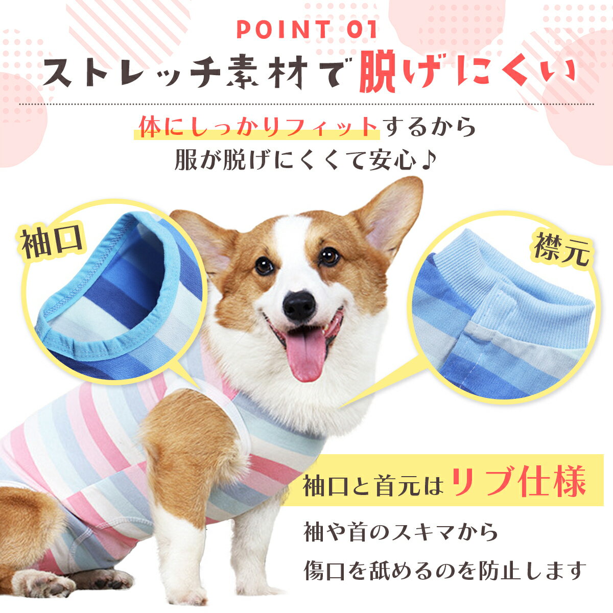 【犬 術後服 おすすめポイント♪】 1. ストレッチ素材 で脱げにくい!! 体にしっかりフィットするから服が脱げにくくて安心♪ -袖口と首元は リブ仕様 袖や首のスキマから 傷口 を 舐める のを防止します。 2.着用したままトイレOK♪ オスはウェアの一部をハサミでカットして使用。 しっぽも出せて着心地◎ 3.背中のボタンで 着脱 カンタン! 体を拭いてあげる時もらくちん♪ 4.薄手で柔らかくサラサラ快適! さらさら生地で服が嫌いなワンちゃんも嫌がらない♪ ■サイズ(※測定場所は画像をご確認ください。) Sサイズ… 胸囲:32cm / 着丈:25cm / 適応体重:1.5〜2.5kg Mサイズ… 胸囲:38cm / 着丈:31cm / 適応体重:2.5〜4kg Lサイズ… 胸囲:44cm / 着丈:35cm / 適応体重:4〜6kg XLサイズ… 胸囲:50cm / 着丈:39cm / 適応体重:6〜9kg ※適応体重は犬種や毛量によって変動します。 ■-カラーバリエーション ピンク ブルー 犬 術後服 エリザベスカラー ソフト オス メス 犬用 服 背中開き 去勢 避妊 エリザベス 手術後 小型犬 中型犬 男の子 女の子 男 女 避妊手術後服 去勢手術後服 犬の術後服 介護服 春 夏 秋犬 術後服 エリザベスカラー ソフト オス メス 犬用 服 背中開き 去勢 避妊 エリザベス 手術後 小型犬 中型犬 男の子 女の子 男 女 避妊手術後服 去勢手術後服 犬の術後服 介護服 春 夏 秋