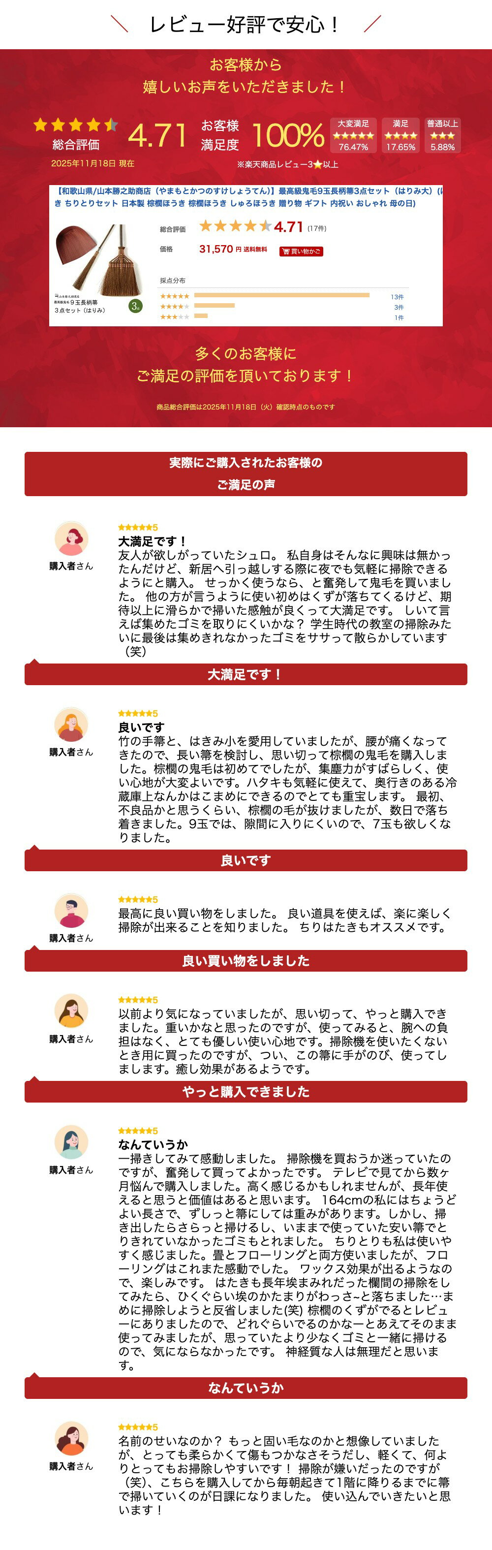 送料別・送料無料商品に関わらず、北海道・沖縄及び離島について、こちらの商品は別途送料が発生いたします。当店にて注文確認メールにて送料が追加されますので必ずご確認ください。 商品についてのお問い合わせはお電話でも受け付けております。 商品説明 明治13年に創業。「かねいち」の商号で親しまれ、創業者、山本勝之助の志を今も引き継ぎ、棕櫚箒(しゅろほうき)や山椒(さんしょう)などの薬種材料等の紀州特産の山産物の製造、販売しています。 一枚の棕櫚の皮から数本しか採れない「鬼毛」という引きが強くしなやかな繊維を使用した「最高級9玉長柄箒」と、掃除機などでは届かないような高いところのホコリや天井の隅のチリをよく落とす「1玉チリハタキ」、和紙に柿渋を塗ってつくられた「はりみ」のちりとりをセットです。棕櫚の良い部分をぎゅっと凝縮されているのが鬼毛です。最高級鬼毛を始めて使うならこのセットをおすすめします!はりみには棕櫚の紐が付いています。 商品情報 ブランド 山本勝之助商店(やまもとかつのすけしょうてん) 生産地 和歌山県 サイズ 最高級鬼毛9玉長柄箒:約 W28×H125cm 1玉チリハタキ:長さ 約79cm(棕櫚部分:約30cm) はりみ(大):約 W30×H27.5cm 材質 最高級鬼毛9玉長柄箒:棕櫚(毛)、竹(柄)、銅線(巻き線) 1玉チリハタキ:棕櫚(毛)、竹(柄)、銅線(巻き線) はりみ(大):和紙(柿渋仕上げ)/ 竹 備考 化粧箱:× 吊り紐:○ 配送・ギフト ネコポス 不可 ギフト包装 ラッピング / ギフトカード / 熨斗※一括ラッピング不可 はじめてご使用になる前に 天然の棕櫚の皮を使用しているため、使い始めほうきから粉が落ちてきます。出来るだけ最初に粉を落として頂ければ使いやすくなるはずです。 最初は畳や、カーペットなどのご使用は粉が落ち、お掃除が逆効果にもなる可能性がありますのでご注意ください。 保管方法 棕櫚ほうきは大事に使用すれば10年20年と長持ちすると言われていますが、床に立て掛けておくと穂先に癖がついてしまいます。ご使用後は壁などに掛けて保管して下さい。 よく利用されるシーン 内祝い/結婚祝い/退職祝い/結婚記念日/誕生祝い/銀婚式/金婚式/結婚式お返し/出産祝い/お祝い返し/お返し/お祝い/入学祝い/就職祝い/還暦祝い/御祝/お礼/プレゼント/誕生日/贈り物/ギフト/引越し祝い/新築祝い/開店祝い/記念日/還暦/古希/喜寿/傘寿/米寿/卒寿/白寿/お中元/御歳暮/2次会/忘年会/家族/母の日/お母さん/父の日/お父さん/敬老の日/新年の挨拶/バレンタイン/ホワイトデー/クリスマス/10周年/100周年/周年祭/お土産/粗品/学校設立/法人設立/上場記念/周年祭/設立記念/独立記念/引き出物/ノベルティ/法人/企業/コンペ/上司/社長/年上/20代/30代/40代/50代/60代/70代/80代/90代/日本/伝統工芸/伝統文化/和風/和/モダン/北欧/シンプル 関連商品【和歌山県/山本勝之助商店(やまもとかつのすけしょうてん)】最高級鬼毛...【和歌山県/山本勝之助商店(やまもとかつのすけしょうてん)】最高級鬼毛...棕櫚 ほうき【和歌山県/山本勝之助商店(やまもとかつのすけしょうてん)...30,580円30,910円8,030円棕櫚 ほうき 7玉長柄箒 東京ちりとりセット |和歌山県/山本勝之助商...棕櫚箒 棕櫚 ほうき 家中大掃除8点セット|山本勝之助商店(かねいち)...棕櫚箒 棕櫚ほうき セット | 山本勝之助商店 家中大掃除8点セット(...8,030円23,936円22,946円---> 注目の棕櫚ほうき商品はこちら 現在、商品画像、セット商品販売を無断で使用し、あたかも山本勝之助商店の商品を正規販売しているようなサイトの存在が確認されております。また値引きを行っているサイトもございます。当店は創業以来、山本勝之助商店をお取り扱いさせて頂いており通算100,000本以上販売させて頂いている正規品となります。