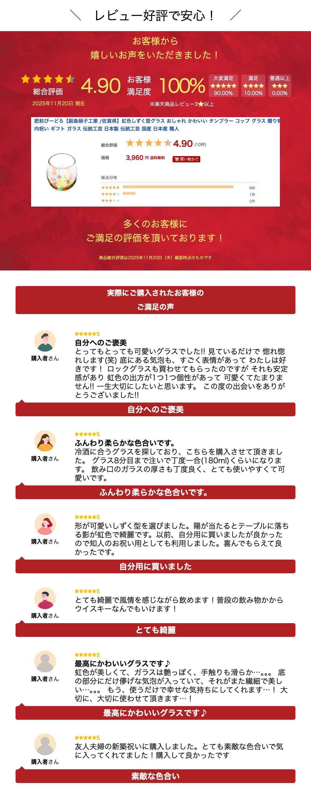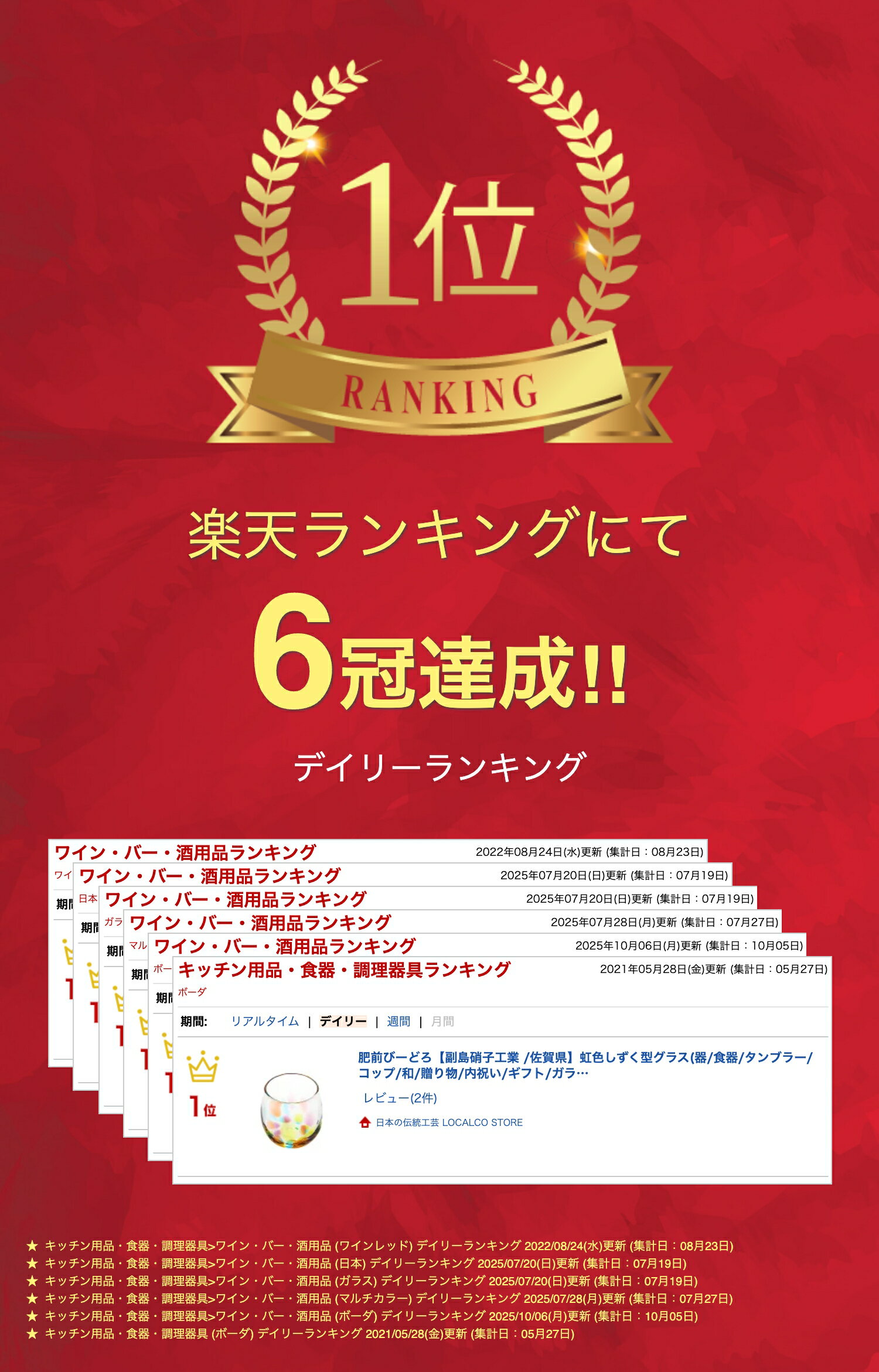 商品についてのお問い合わせはお電話でも受け付けております。 ノスタルジックな肥前びーどろ 商品説明 肥前びーどろは、佐賀市の重要無形文化財。宙空で成形する「宙吹き」などの、特徴的な製法を受け継いでいます。「虹色シリーズ」は、副島硝子工業が難易度の高い製法を用いて使った新たなシリーズ。5色の色ガラスを使い、装飾品のように美しい虹の彩を作り出します。しずく型グラスはワイングラスのような丸い形状により、香りを逃しにくいのが特徴。可愛らしいシルエットのため、ワインや梅酒を楽しむ女性におすすめです。 商品情報 ブランド 副島硝子工業(そえじまがらすこうぎょう) 生産地 佐賀県 サイズ 口径8.5cm×高さ8cm 容量 約200cc(満水)※商品により個体差がございます 材質 ガラス 備考 化粧箱:○ 食器洗浄機:○ 乾燥機:○ 配送・ギフト メール便 不可 ギフト包装 ラッピング / ギフトカード / 熨斗 ご注文の前にご確認ください 商品は全て手作りの吹きガラスため、記載されているサイズ、形とは若干異なる場合があります。ご了承ください。 よく利用されるシーン 内祝い/結婚祝い/退職祝い/結婚記念日/誕生祝い/銀婚式/金婚式/結婚式お返し/出産祝い/お祝い返し/お返し/お祝い/入学祝い/就職祝い/還暦祝い/御祝/お礼/プレゼント/誕生日/贈り物/ギフト/引越し祝い/新築祝い/開店祝い/記念日/還暦/古希/喜寿/傘寿/米寿/卒寿/白寿/お中元/御歳暮/2次会/忘年会/家族/母の日/お母さん/父の日/お父さん/敬老の日/新年の挨拶/バレンタイン/ホワイトデー/クリスマス/10周年/100周年/周年祭/お土産/粗品/学校設立/法人設立/上場記念/周年祭/設立記念/独立記念/引き出物/ノベルティ/法人/企業/コンペ/上司/社長/年上/20代/30代/40代/50代/60代/70代/80代/90代/日本/伝統工芸/伝統文化/和風/和/モダン/北欧/シンプル/目上 関連商品肥前びーどろ【副島硝子工業 /佐賀県】虹色ロックグラス おしゃれ か...肥前びーどろ【副島硝子工業 /佐賀県】虹色ロック ペアセット ペアタ...虹色しずく型グラス ペアセット |佐賀県/肥前びーどろ(ひぜんびー...3,960円7,920円7,920円肥前びーどろ【副島硝子工業 /佐賀県】波ロック おしゃれ かわいい ...虹色タンブラー |佐賀県/肥前びーどろ(ひぜんびーどろ)| おしゃれ...虹色ビアグラス |佐賀県/肥前びーどろ(ひぜんびーどろ)| お...4,730円3,960円3,960円ビアグラス 虹色一口ビール |佐賀県/肥前びーどろ(ひぜんびーどろ)...東京都 木村硝子店 (キムラガラステン) TY-ジュンマイ100(TY...虹色ビアグラス ペアセット |佐賀県/肥前びーどろ(ひぜんびーどろ...3,960円3,520円7,920円ワイングラスのような丸いシルエットで女性の手にもすっぽり収まるグラスです。 「肥前びーどろ」と聞いても、耳慣れない人が多いかもしれません。佐賀市の重要無形文化財に指定されている「肥前びーどろ」は、型を用いず息を吹き込んで、宙空で成型する“宙吹き(ちゅうぶき)”でつくられるガラス食器の伝統工芸品です。江戸時代末期から続く技術を受け継ぎ、明治36年より作られ始めました。 精錬方(現在の理化学研究所)で西洋の科学技術の研究に必要不可欠だったビーカーやフラスコなどのガラス製品を作っていた職人たちは、明治維新後にランプや食器などを作り始めました。透明だったガラスに色をつけ、文様を入れることで、時代のニーズにあった暮らしのガラス製品を生み出していったものが、現代に継承されています。 「肥前びーどろ」の最大の特徴は、宙吹き技術のひとつである“ジャッパン吹き”にあります。鉄の吹き竿の代わりにガラスの友竿(ともざお)を使うことによって、空気以外のものに触れることがないため、よりなめらかでやわらかな肌合いに仕上がることから、高品位のガラス器として珍重されています。 この最も原始的かつ難しいと言われる宙吹き製法を用い、赤・黄・青・紫・水色の5つの色ガラスを使って虹を表現したのが「虹色シリーズ」です。ガラスの透明感が際立つ可愛らしい色合いが女性の人気を集めています。 手づくりゆえにひとつひとつ、わずかに異なる形状。表面にあえて凹凸をつけることにより、色彩に豊かな表情を持たせ、独特の風合いをアップしています。あえて気泡を入れることで、ガラスの透明感をさらに際立たせています。 虹色シリーズの「しずく型グラス」は、ワイングラスのような丸い形状により、香りを逃しにくいのが特徴。女性の手にもすっぽり収まる、持ちやすいサイズです。可愛らしいシルエットは、ワインや梅酒を楽しむ女性にぴったり。内祝いや、引き出物としても喜ばれます。