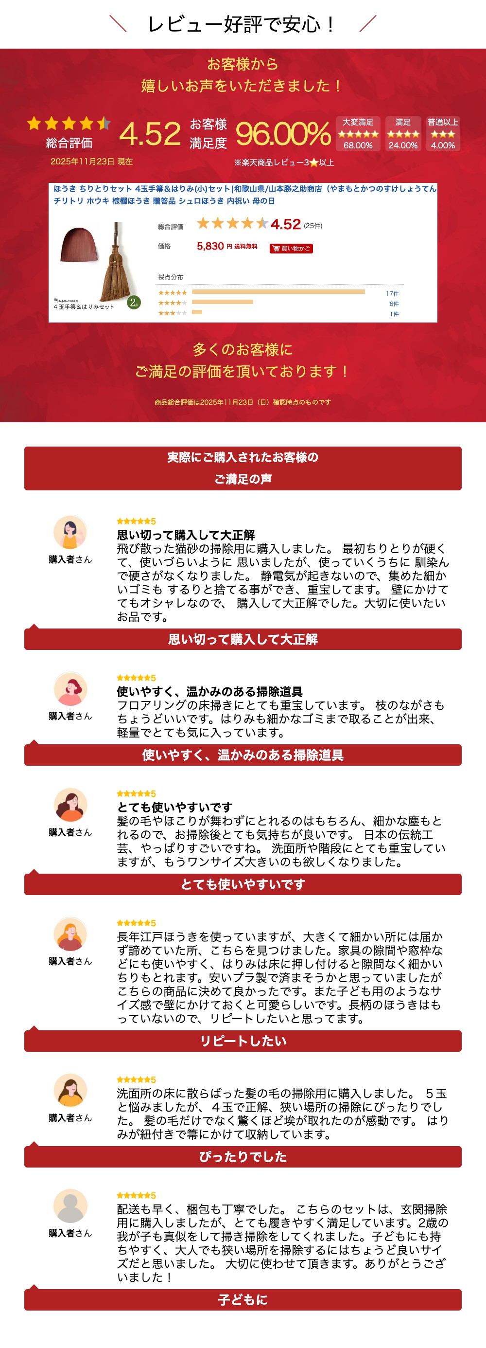 商品についてのお問い合わせはお電話でも受け付けております。 商品説明 明治13年に創業。「かねいち」の商号で親しまれ、創業者、山本勝之助の志を今も引き継ぎ、棕櫚箒(しゅろほうき)や山椒(さんしょう)などの薬種材料等の紀州特産の山産物の製造、販売しています。 人気の5玉手箒よりも一回り小さい4玉手箒と「はりみ」のちりとりセット。お部屋の隅や猫の砂などのチョットしたお掃除に最適の箒です。 忙しく夜家事が中心のになってしまっている方にも、赤ちゃんやペットがいるご家庭にも、音が出ない、床を傷つけない箒で始めるエコなお掃除生活。 和紙に柿渋を塗ってつくられた、白木屋傳兵衛の「はりみ」は、自然素材のため静電気が起きにくく、ゴミ箱に捨てるときはゴミや埃がサラリと落ちます。 間口は約1mmと薄いため、掃き残しが少ないのも特徴です。棕櫚の紐が付いています。 商品情報 ブランド 山本勝之助商店(やまもとかつのすけしょうてん) 生産地 和歌山県 サイズ 4玉手箒:約W13×H60cm はりみ 小:約W20×D20×H7cm、間口厚さ:1mm 材質 4玉手箒:棕櫚(毛)、竹(柄)、銅線(巻き線) はりみ 小:和紙(柿渋仕上げ)/ 竹 備考 化粧箱:× 吊り紐:○ 配送・ギフト ネコポス 不可 ギフト包装 ラッピング / ギフトカード / 熨斗※一括ラッピング不可 はじめてご使用になる前に 天然の棕櫚の皮を使用しているため、使い始めほうきから粉が落ちてきます。出来るだけ最初に粉を落として頂ければ使いやすくなるはずです。 最初は畳や、カーペットなどのご使用は粉が落ち、お掃除が逆効果にもなる可能性がありますのでご注意ください。 保管方法 棕櫚ほうきは大事に使用すれば10年20年と長持ちすると言われていますが、床に立て掛けておくと穂先に癖がついてしまいます。ご使用後は壁などに掛けて保管して下さい。 よく利用されるシーン 内祝い/結婚祝い/退職祝い/結婚記念日/誕生祝い/銀婚式/金婚式/結婚式お返し/出産祝い/お祝い返し/お返し/お祝い/入学祝い/就職祝い/還暦祝い/御祝/お礼/プレゼント/誕生日/贈り物/ギフト/引越し祝い/新築祝い/開店祝い/記念日/還暦/古希/喜寿/傘寿/米寿/卒寿/白寿/お中元/御歳暮/2次会/忘年会/家族/母の日/お母さん/父の日/お父さん/敬老の日/新年の挨拶/バレンタイン/ホワイトデー/クリスマス/10周年/100周年/周年祭/お土産/粗品/学校設立/法人設立/上場記念/周年祭/設立記念/独立記念/引き出物/ノベルティ/法人/企業/コンペ/上司/社長/年上/20代/30代/40代/50代/60代/70代/80代/90代/日本/伝統工芸/伝統文化/和風/和/モダン/北欧/シンプル 関連商品棕櫚 ほうき 5玉棕櫚手箒&はりみ(大)セット|和歌山県/山本勝之助商...棕櫚ほうき&はりみセット 3玉荒神箒+はりみ(小) | 山本勝之助商店...棕櫚 ほうき 7玉長柄箒&3玉荒神箒大セット|和歌山県/山本勝之助商店...6,600円3,740円7,788円棕櫚 ほうき 7玉長柄箒 東京ちりとりセット |和歌山県/山本勝之助商...【和歌山県/山本勝之助商店(やまもとかつのすけしょうてん)】5玉棕櫚長...棕櫚 ほうき【和歌山県/山本勝之助商店(やまもとかつのすけしょうてん)...8,030円7,260円8,030円---> 注目の棕櫚ほうき商品はこちら 現在、商品画像、セット商品販売を無断で使用し、あたかも山本勝之助商店の商品を正規販売しているようなサイトの存在が確認されております。また値引きを行っているサイトもございます。当店は創業以来、山本勝之助商店をお取り扱いさせて頂いており通算100,000本以上販売させて頂いている正規品となります。