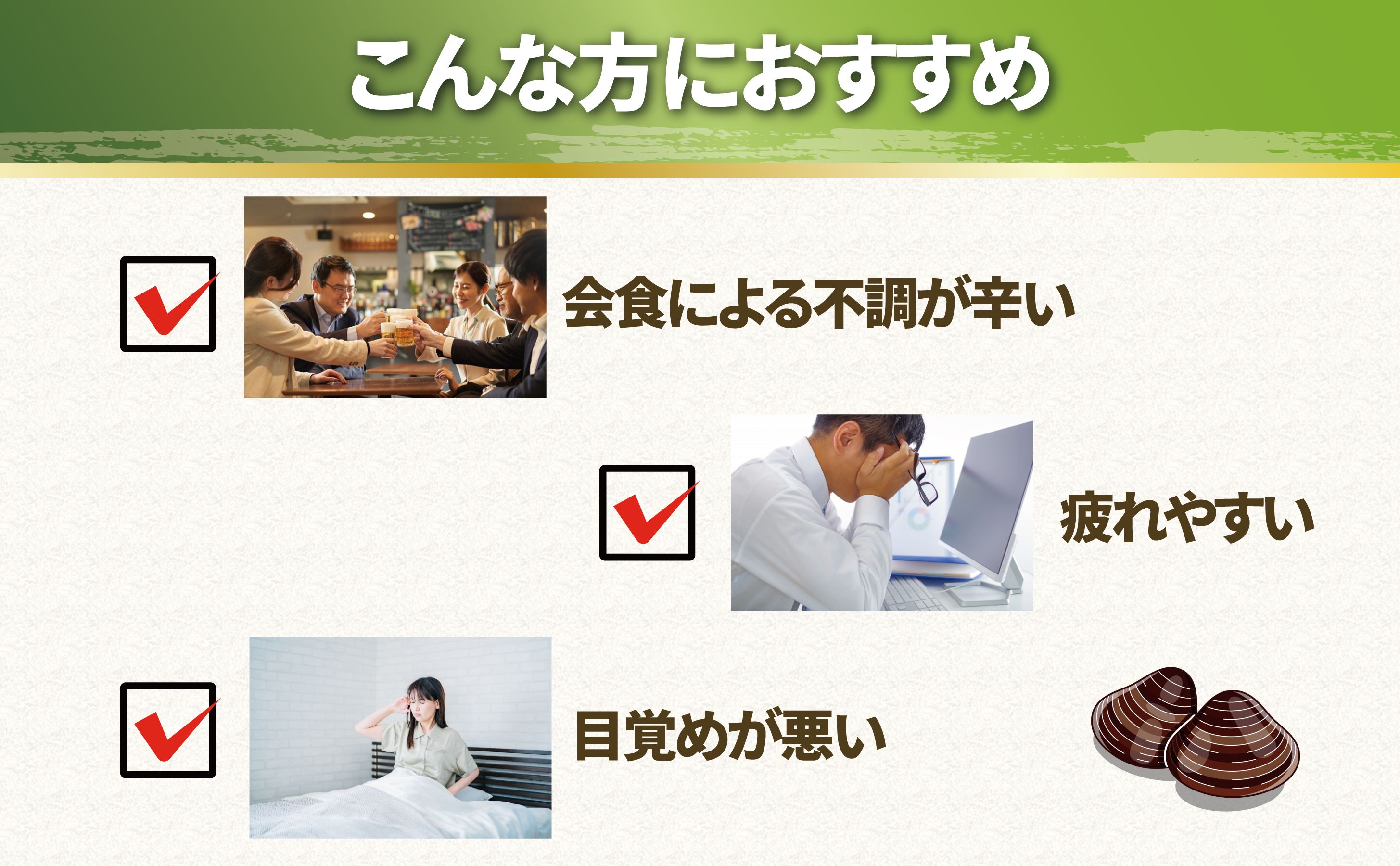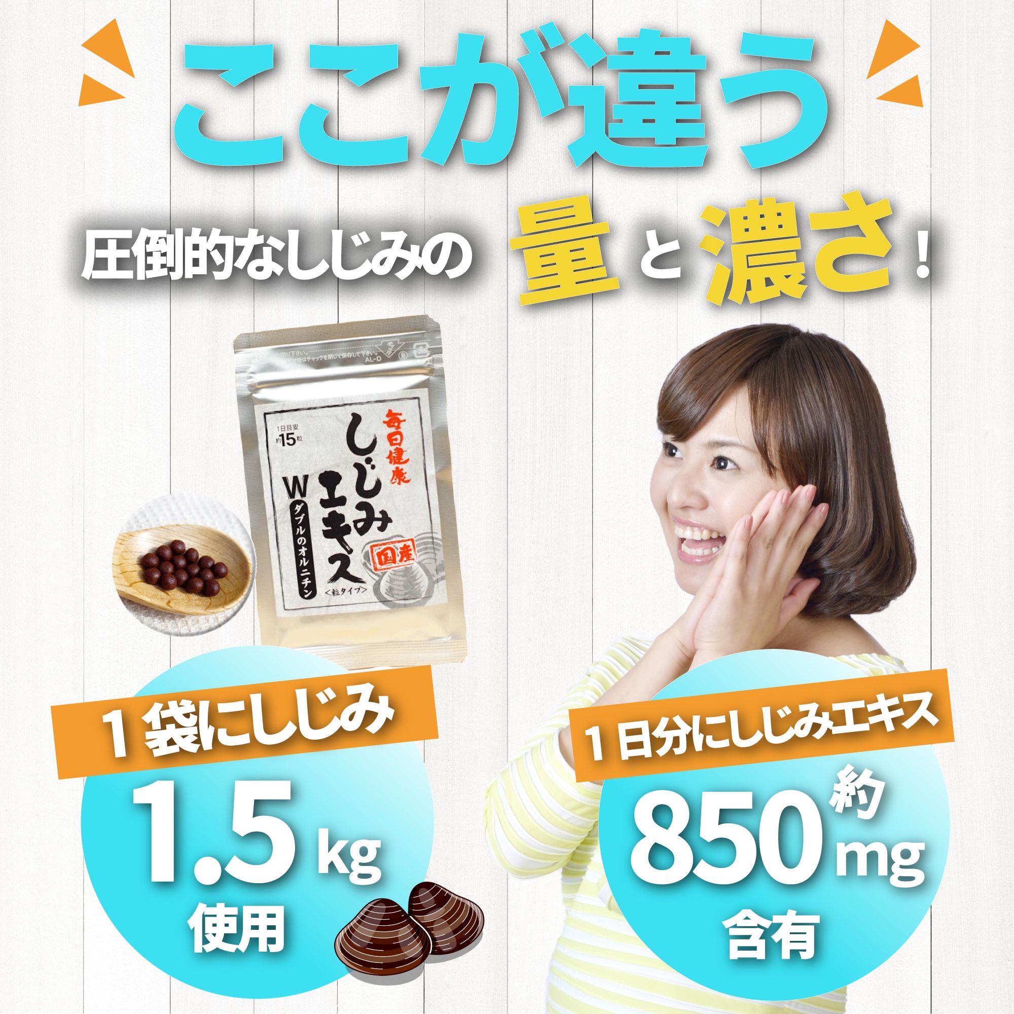 商品名しじみエキス Wのオルニチン名称しじみ加工食品内容量17g原材料ヤマトしじみ(木曾川産)・とうもろこし澱粉(遺伝子組換えではない)・メープルシロップ・酸化防止剤(ビタミンE)賞味期限商品パッケージ裏面に記載保存方法直射日光、高温多湿を避けて冷暗所に保存してください。お召し上がり方1日15粒を目安に水またはぬるま湯と一緒にお召し上がりください。摂取上の注意体質に合わないと思われるときは、お召し上がり量を減らすか休止してください。また原材料をご確認の上、食物アレルギーのある方はお召し上がりにならないでください。広告文責株式会社リアルメイト 052-220-0651メーカー/販売者株式会社リアルメイト 愛知県名古屋市中区錦1丁目7-34 ステージ錦7階商品区分日本製/栄養補助食品この商品について【しじみは栄養の宝庫】130年間製法を守り続けている、しじみのサプリメントです。栄養たっぷりのしじみエキスを飲みやすく粒タイプにしました。しじみはアミノ酸が豊富に含まれており、必須アミノ酸9種類を全て凝縮しました! 【しじみの量と濃さが実感力の秘密!】日本人が伝統的に摂取してきた健康食のしじみを手軽に一年中摂取できるようサプリメントにしました。1袋にしじみ1.5kgものしじみを使用!1日分にしじみエキスが約850mgも含まれています。品質とお求めやすさを両立したサプリメントです。 【国産しじみ使用】外国産のしじみが多い中、木曽川のやまとしじみだけを使用しています。リアルメイトの100%国産のしじみエキスWオルニチンは、木曽川で採ったしじみを木曽川河口にある工場でそのまま加工します。職人さんが手作業でしじみを選別し、手作業で煮詰めて作られています。 【Wのオルニチンパワー】天然のオルニチン+発酵オルニチンのWのオルニチンは1日あたり100mg配合!さらに実感力を追求。お付き合いが多い、お酒が好き、翌朝目覚めが悪い、疲れやすいそんな方におすすめのオルニチンサプリメントです。関連商品はこちら≪しじみエキス850mg配合!≫ しじみ サ...5,842円≪しじみエキス850mg配合!≫ しじみ サ...10,234円≪しじみエキス850mg配合!≫ しじみ サ...15,222円