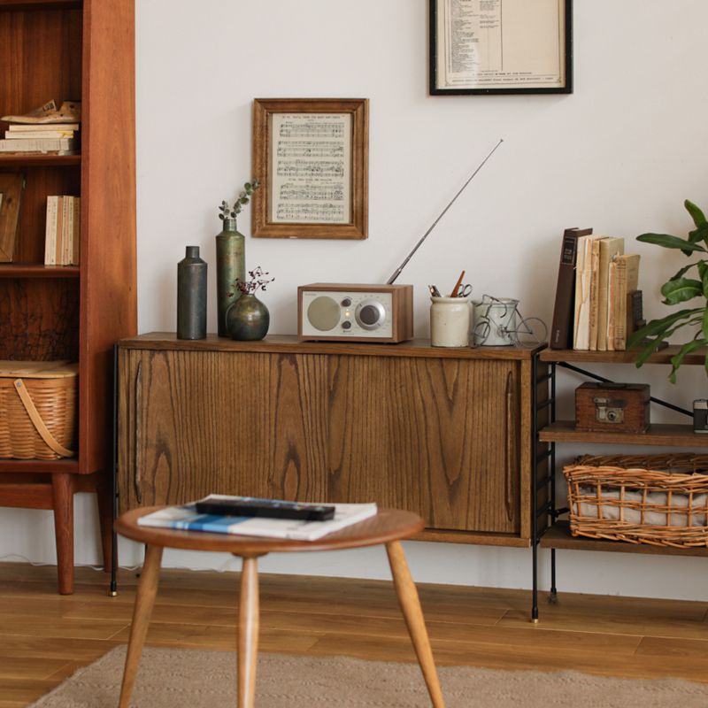 SPECスペック サイズ 幅 21.3cm × 奥行き 13.4cm 高さ 11.5cm梱包サイズ:幅 27cm × 奥行き 25.5cm × 高さ 18cm カラー オークブラック ウォールナットベージュ 素材 オークブラック:天然木オーク突板ウォールナットベージュ:天然木ウォールナット突板 備考 重量:約 1.9kg完成品Bluetooth5.0AM / FMアナログ・モノラルラジオ・スピーカードライバ:3インチ型フルレンジ入力端子:FM受信、AM受信、AUX入力電源:AC100V 50/60 HZ(ACアダプター)12VDC 500mA(本体)受信周波数(FM):76.0〜95.0 MHz(ワイドFM)受信周波数(AM):520〜1629KHz付属品:FMアンテナ、電源コードメーカー保証:1年電子レンジやコンセント付近でのご使用は、Bluetoothの妨げになりますのでご遠慮ください。こちらの商品は天然木を使用しているため、木目やフシの風合い、色味などが画像と異なる場合がございます。 カテゴリー:家電手作りの木製キャビネットが目を惹くテーブルラジオみなさんは普段、何を使ってラジオや音楽を聴いていますか?スマートフォンやパソコンなどで手軽に楽しめるようになった時代。そんな今でも、自信を持っておすすめできるオーディオがあります。世界で最もシンプルなラジオとして知られる「Model One BT(モデルワン ビーティー)」。レトロなデザインと臨場感のある音質が魅力です。リセノでも愛用しているスタッフが多く、休憩室にも取り入れているほど。昔ながらのダイヤルチューニングとシンプルなデザインは、発売から20年以上経った今でも多くの人々に愛され続けています。オーディオといえば無機質で未来的な外見が多いですが、Model One BTは天然木に包まれた温かみのあるデザイン。また、マットな質感のノブが上質な印象をプラスしてくれます。ほっこりとどこか懐かしさを感じる姿は、リセノが提案する「ナチュラルヴィンテージ」とも相性抜群。しっくりと生活に馴染んでいきます。リセノのスタイリングにも何度も登場しているので、目にしたことがある方もいらっしゃるのではないでしょうか。私たちにとっても、今ではなくてはならないアイテムなんです。スイッチは1つ、ダイヤルは2つ。わずか3つのノブで全ての操作が可能です。操作は簡単。電源スイッチとソース切替用のノブ、ボリューム用のノブ、そしてラジオチューニングダイヤルの計3つのノブしかない、シンプルな装置です。ラジオチューニングダイヤルは5度ツマミを動かすと1度チューニングが進む「5:1レートダイヤル」を採用。つまり、くるくると軽く回るのではなく、ぐーっと少し重みのある回し心地です。欧米では数百チャンネルもの放送局があるので、正確にチューニングができる設計の、このダイヤルが採用されています。自動的にチューニングされるのではなく、ダイヤルの重みを感じながら、自分で合わせに行くという使い心地がまた、心をくすぐります。ボリューム用のノブは独立しているので、いったん音量を固定すれば触る必要がありません。また、電源スイッチはソース切替用ノブに統合。電源を入れると同時に、FM/AMの選択、さらに外部入力(Bluetoothの受信)の切り替えを行うことが可能です。無駄な機能を一切捨て去っているので操作ミスをする心配もなく、スイッチを入れてすぐにお使いいただけます。人の声を美しく再現。Bluetooth機能も内蔵しています。Model One BTを初めて使ったとき、音質の良さに驚きました。音楽に関しては素人の私でも、「音に奥行きがある!」と感じるほど。特に低音がいいんです。その理由は構造にあります。単なる木製の箱に見えますが、実はこの筐体は二重構造。スピーカーの背面から出た音をキャビネット内で反射させ、底面ポートから送り出すバスレフ構造によって再生しています。これにより、誰が聴いても臨場感のある音がするのです。大音量でも歪みがないので、長時間聴いていても耳が疲れません。ラジオ機能も内蔵しており、FM/AMラジオを選択することが可能。放送の声が聞き取りやすいのは、音と感度に対する長年にわたる研究から見出した、独自の設計によるものです。以前は「ラジオアプリで十分」と思っていた私も、その音質の違いを実感してから、アプリでは物足りなく感じるようになりました。ラジオチューニングダイヤルを回していつも聴くラジオ局を選局。すると、「ザザザ...」というノイズ音に混じって、徐々にパーソナリティーの方の声が聞こえてきます。それがなんだか懐かしく、ラジオが何倍も魅力的に感じるんです。Model One BTでラジオを聴きたくなるのは、音質の良さにプラスした、少し懐かしいアナログさにあるのだと思います。電波が気になる場合は、付属のアンテナを伸ばしてみてください。天気が悪かったり、地域や周辺の環境によって音が悪く感じることもありますが、アンテナの向きや別売りの外部アンテナで調整することもできます。発売から20年に渡りデザインは変わっていませんが、機能面は時代とともに変化しています。Model One BTはBluetooth機能を搭載しており、スマートフォ