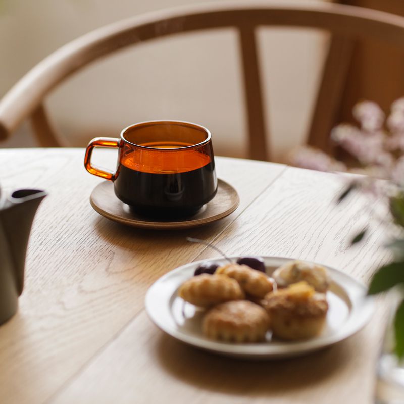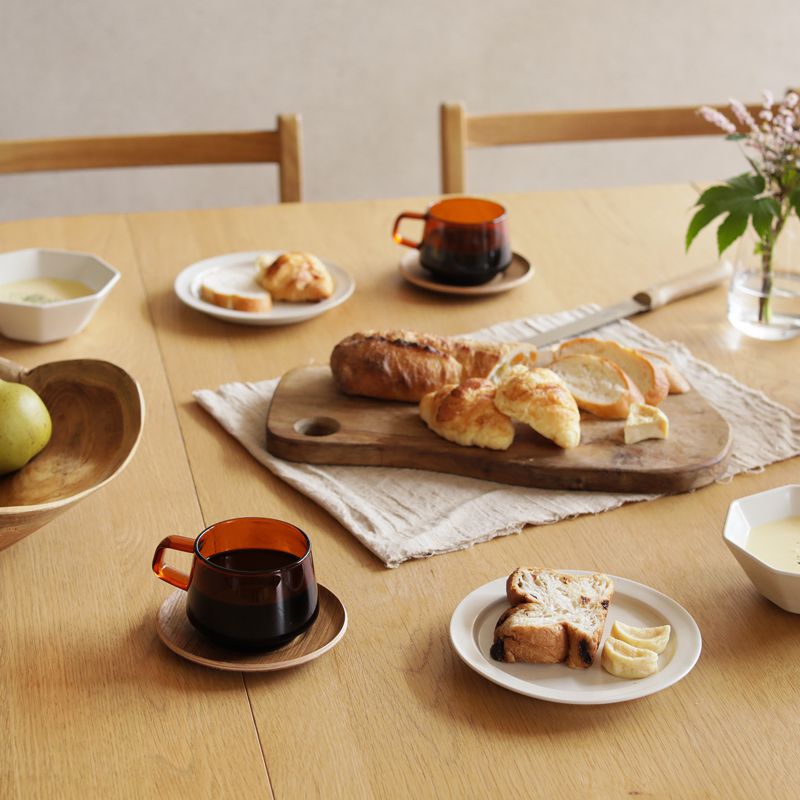 SPECスペック サイズ カップ:直径 7.5cm × 高さ 6.5cmソーサー:直径 13cm × 高さ 1.7cm梱包サイズ:幅 13cm × 奥行き 13cm × 高さ 9cm カラー アンバー 素材 カップ:耐熱ガラス(耐熱温度差120℃)ソーサー:合成漆器、天然木チーク積層材(ウレタン塗装) 備考 重量:165g容量:270mlカップ:電子レンジ、食洗機使用可ソーサ—:電子レンジ、食洗機使用不可カップは、電子レンジでの加熱のしすぎや空焚きにはご注意ください。ソーサーは、水やお湯に浸さず、固く絞ったふきんでお手入れしてください。手作業での作成の為、サイズや形状に個体差が生じます。天然木を使用している為、木目やフシの風合い、色味などが画像と異なる場合がございます。 カテゴリー:マグカップ蚤の市で見つけたようなどこか懐かしいカップ&ソーサー 深みのある琥珀色と、横広めのぽってりとしたデザインが特徴のカップ&ソーサー「SEPIA(セピア)」。その佇まいになんだか惹かれるのは、昔ながらの喫茶店や蚤の市にありそうな、懐かしさや味わいを感じるからかもしれません。SEPIAは、カップにガラスを、ソーサーにはウッドを使用しています。あまり他では見かけない異素材を組み合わせたカップ&ソーサーは、テーブルコーディネートのちょっとしたアクセントに。こっくりとした色合いも相まって、食卓をぐっと引き締めつつ、温かい雰囲気をプラスしてくれます。カップ&ソーサーというと、来客時の「おもてなし」という印象が強いかもしれません。ところが、普段の生活でも小さなところで役立ってくれるんです。例えば、飲み物がうっかりこぼれてしまった時や、使い終わったスプーンを置く場所がない、という時。ソーサーがあれば、そんなちょっとした汚れをしっかりと受け止め、テーブルが汚れるのを防いでくれます。テーブルの輪ジミ防止にも一役かってくれます。それだけでなく、カップ&ソーサーを使うことで生まれる「きちんと」感が、いつものおやつ時間を特別に演出してくれるんです。 使いやすさに拘った機能的なデザイン 四角い形のハンドルは、指が滑りにくく持ちやすい設計。その秘密は、少し厚めの持ち手。しっかりと指をかけることが出来るため、力が入れやすいんです。カップ&ソーサーを使う際に少しだけ不便に感じるのが、慎重に運ばないとうっかりこぼしてしまいそうになること。特に、一般的な陶器やガラスなどのツルツルとした素材感同士は滑りやすいのがデメリットです。SEPIAは、そんな小さな不便さもしっかりとカバー。ウッド素材のソーサーには、滑りにくくするノンスリップ加工と、カップがフィットするようなデザインが施されています。そのため、運ぶ際にカップが揺れ動く心配が少なく、安心して運ぶことが出来るんです。収納時には、スタッキングも可能。ぴったりと重ねることができるため、かさばることなく、安定感があるのも嬉しいポイントです。 ホットから、アイスまで。幅広く使えるガラスカップ SEPIAのカップは耐熱ガラス製なので、ホットからアイスまで幅広くお使いいただけます。こっくりとした琥珀色は、テーブルスタイリングのアクセントに。「ナチュラル」なテーブルコーディネートに「味わい」を加えることで全体がぐっと引き締まり、より魅力的な食卓を作り出すことができます。ガラス素材なので、もちろん夏にもぴったり。琥珀色のガラスは、透明のガラスとは、ひと味違った魅力を感じることができます。ガラスならではの「ゆらぎ」も含めてお楽しみください。また、夏場の冷たい飲み物は、温度差によって水滴がつくことも。SEPIAならば、手を汚すことなく使えるのも嬉しいポイントです。横広のデザインなので、ちょっとしたデザートカップとしても。例えば、バニラアイスにエスプレッソをかけたアフォガードなんていかがでしょう。持ち手がついているので、食べやすさも抜群です。ソーサーにスプーンを添えて出すだけで、まるでカフェのような特別おやつに。そんな楽しみ方もいいかもしれません。 電子レンジ・食洗機に対応。普段使いとして安心です。 SEPIAは耐熱ガラス製なので、電子レンジ・食洗機のどちらも使用可能。冷めてしまった飲み物をさっと温め直すことができたり、食洗機にも対応できる耐久性は、忙しい現代人のライフスタイルにしっかりと寄り添ってくれます。気軽に使えて、普段使いとして使いやすい点も大きな魅力です。 気になるカップの汚れ。「使ったら洗う」の習慣づけを。 カップを使用して気になるのは、茶渋やシミなどの汚れ。丁寧に使っているつもりなのに、どうしても汚れがついてしまったり、一度ついてしまうとなかなか落ちてくれない、なんてこともありますよね。そんな汚れを予防するために、まずは使ったらすぐ洗うように心がけましょう。すぐに洗えないという場合は、水に浸してつけて置くだけでも、効果的です。ちょっとしたひと手間ではありますが「使ったら洗う」という習慣をつけることで、カップが