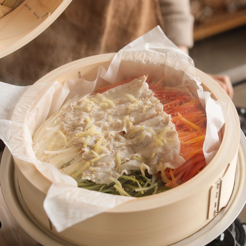 SPECスペック サイズ 直径 27cm × 高さ 15cm カラー ひのき 素材 天然木ひのき 備考 重量:約 1000g日本製電子レンジ・食洗機・オーブン:使用不可金属たわしは破損の原因になるため、棕櫚の束子のご使用がおすすめです。合成洗剤や漂白剤は使用せず、粉状のクレンザーや塩をご使用ください。洗浄後は、風通しのよい日陰でしっかりと乾燥させてください。保管の際は、吸水性の良い紙か綿布に包み、通気性が良く、ある程度湿気のあるところに置いてください。こちらの商品は天然木を使用している為、木目やフシの風合い、色味などが画像と異なる場合がございます。 こちらの商品は、他タイプ・適合する蒸し板の展開がございます。下記リンクより、他ページをご覧いただけます。 21cm/1段はこちら 27cm/1段は現在のページです。 21cm/2段はこちら 27cm/2段はこちら 蒸し板/30cmはこちら カテゴリー:鍋・せいろ・おひつ簡単、ヘルシーで美味しい。もう手放せない「中華せいろ」のある暮らしふわっと立ち昇る湯気、木の香りとともに漂う食材の香り。蒸している時から、これは美味しいものが出来上がってるに違いない!と、立ち昇る湯気を見ているだけで幸せな気持ちになります。一見、手間がかかりそう、どうやって使うの?と思われがちな「中華せいろ」ですが、いざ使ってみると、手軽でその魅力はたっぷり。とても使い勝手がよく、美味しくてヘルシー。そして何より失敗が少なく、片付けも楽々。いいことづくしの「ひのき中華せいろ」は、私の中では暮らしに欠かせない調理器具になっています。蒸し上がったら、お皿に乗せてそのままテーブルへ。特別な盛り付けはいりません。開けた瞬間に立ち昇る湯気が、食卓を盛り上げます。ちょっとしたおもてなしやお祝い事の場はもちろん、普段の食事でも中華せいろが並ぶだけで、豊かな風景に。そして置いてあるだけで絵になる佇まいも、中華せいろの魅力の一つです。まるで料理家さんのキッチンみたいなこだわりを感じる雰囲気に。ぜひ特等席を決めてあげて、使い込むほどに味が出て育っていく姿をお楽しみください。長くご愛用いただける技術が詰まった「檜せいろ」中華せいろに使う素材には、竹や杉、檜(ひのき)と様々な種類がありますが、リセノでは檜で作られた中華せいろを採用しました。檜は上質な木目で、香りはほんのりと、そして耐久性が高いという点が魅力です。他の素材と比べるとお値段はちょっと高くなりますが、長く使っていただきたいため、檜を選びました。耐久性が高い理由は、素材はもちろん、熟練の職人さんが作り出す厚みにも。まず檜の薄い板を煮て柔らかくし、丸く曲げていきます。丸くなった檜を複数層にして側壁を厚くし、固くすることで壊れにくいせいろに。実際に持ってみると、その厚みや硬さに驚きます。日常使いしたいせいろ、丈夫さがあることで、安心してお使いいただけます。長く使っていただくことで、どんどん愛着も増して、手放せない相棒になります。そして蓋は、竹を使った網代編み。一層だと蒸気の蒸れが多いため、二層にして余分な蒸気を程よく逃します。そうすることで水滴が食材に落ちづらくなり、素材そのものの旨味をギュッと閉じ込めることができるのです。同時に水分量も調整してくれるので、食材をムラなく、じんわりと蒸すことができます。火にかけておくだけでおいしい。素材本来の味が楽しめる蒸し料理「せいろ」、「蒸し料理」と聞くと、ハードルが高いと思われるかもしれません。実はそんなことはなく、材料をせいろへ並べて、野菜やお肉なら10?15分ほど、お米なら30分ほど蒸すだけで出来上がりです。じっくりと火を通すことで、野菜の甘味やお肉、魚の旨味を引き出してくれるため、特別な技術はいらないのです。電子レンジだと抜けがちな水分も、茹でると流れてしまう栄養分も、中華せいろなら旨味として残してくれるので、ふっくら美味しい料理が出来上がるのです。こんな簡単に、そして豊かで美味しい料理を作ることができるので、料理が苦手な私はとても重宝しています。忙しい朝こそ、中華せいろは大活躍。朝食メニューをサッと用意することができます。例えば、小さな耐熱皿をそのまま中華せいろへ入れて、その中には卵を。周りに野菜やパンも一緒に入れちゃいます。野菜も朝からしっかり摂れて栄養も満点。意外!と思われるか知れませんが、パンも蒸すとふっくら柔らかになるんです。カリッとしたパンがお好きな方は、蒸した後に、トースターへ入れると、外はカリっ、中はモチモチなパンの出来上がり。朝の身支度前に、中華せいろへぽんぽんと具材を乗せて、支度をしている間に完成です。おこわもおすすめしたいレシピの1つ。炊飯器や圧力鍋でも作れますが、中華せいろで作るとふっくらと柔らか。それでいて粒が立ち、しっかりとした食感に。より本格的な味に仕上がります。暮らしに合わせてお使いいただけるよう、「21cm」と「27cm」を