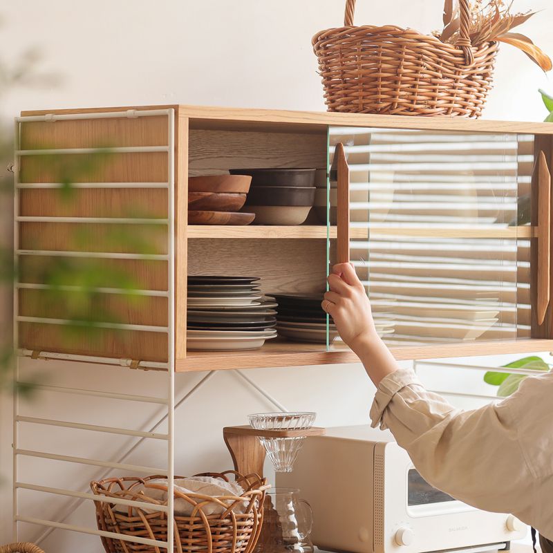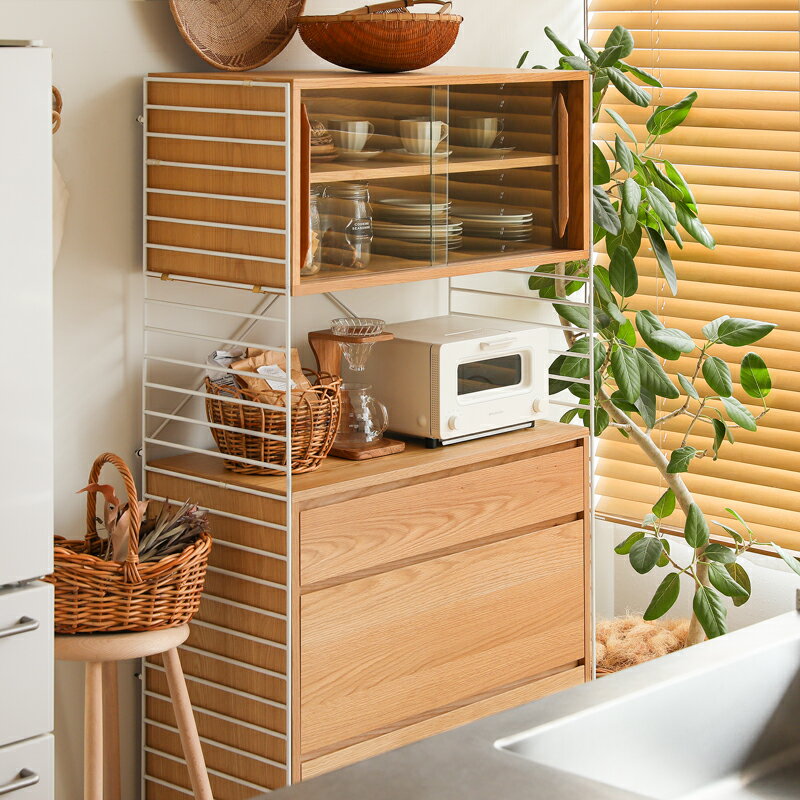 SPECスペック サイズ 本体サイズ:幅 91cm × 奥行き 43cm × 高さ 165cm(ガラスキャビネット 5cmピッチで調節可)ドロワー:幅 88cm × 奥行き 40cm × 高さ 91cm引出上段内寸:幅 78.5cm × 奥行き 29cm × 高さ 7.5cm引出中段内寸:幅 78.5cm × 奥行き 29cm × 高さ 18cm引出下段内寸:幅 78.5cm × 奥行き 29cm × 高さ 27cmガラスキャビネット:幅 88cm × 奥行き 40cm × 高さ 39cm(棚板1枚付 3cmピッチ5段階調節)内寸:幅 84cm × 奥行き 33cm × 高さ 35cm【梱包サイズ】幅 95cm × 奥行き 47cm × 高さ 98cm(64kg)×1幅 94cm × 奥行き 44cm × 高さ 44cm(23kg)×1幅 115cm × 奥行き 3cm × 高さ 3cm(0.8kg)×2幅 44.5cm × 奥行き 167cm × 高さ 3cm(7.5kg)×2 カラー ブラック×ナチュラル ブラック×ミッドブラウン ホワイト×ナチュラル グレー×ナチュラル 素材 ドロワー:天然木ホワイトオーク無垢材、突板(ウレタン塗装)ガラスキャビネット:オーク材突板/無垢材(ウレタン塗装)、ガラスフレーム:鉄(粉体塗装) 耐荷重 ドロワー天板:35kg(引出1杯あたり:10kg)ガラスキャビネット:10kg(棚板:8kg) 備考 本体重量:92.8kg梱包重量:103.6kg組立品(時間:2名で約 20分)※必ず2名以上での組立作業を行って下さい。パーツ組立の際は、必ず2名以上で作業を行って下さい。フレームに棚板等の各パーツを設置する際は、取り付け位置に付属の固定用チューブを巻き付けることで本体が安定します。安全確保のため、必ず取り付けて下さい。組立後の移動は収納物を取り除き、2名以上で左右からフレーム部分をしっかり持ち、慎重に移動してください。棚が外れて物が落ち、思わぬケガ等の原因になることがあります。耐荷重は、棚板全体に荷重が均等にかかった時の最大数値です。転倒や棚板の変形を防ぐため、バランスよく荷重を分散させてご使用下さい。フレームに棚板等の各パーツを設置する際は、取り付け位置に付属の固定用チューブを巻き付けることで本体が安定します。安全確保のため、必ず取り付けて下さい。組立後の移動は収納物を取り除き、2名以上で左右からフレーム部分をしっかり持ち、慎重に移動してください。棚が外れて物が落ち、思わぬケガ等の原因になることがあります。こちらのおすすめセットには、ハンギングフックと固定クランプが付属しております。個別でお買い求めいただく必要はございませんので、ご注意くださいませ。【無垢材の特性について】天然木を使用しているため、木目やフシの風合い、色味などが画像と異なる場合がございます。また、無垢材は乾燥に弱いため、冬場などは加湿器などを利用し、お部屋の空気が乾燥しすぎないよう、ご注意ください。極度に乾燥させた場合、木材にヒビが入る場合がございます。乾燥によるヒビ割れは、お手入れによって防ぐことができます。 お届けについて こちらの商品は「アートセッティングデリバリー(ASD)社」にてお届けいたします。ASD社の提供サービス都合により、一部地域において配送ができない曜日・時間帯がございます。対象地域についてはこちらをご覧ください。 こちらの商品は、タイプ展開がございます。下記リンクより、他タイプのページをご覧いただけます。 シェルフボードセットはこちら こちらの商品は、タイプ展開がございます。下記リンクより、他サイズのページをご覧いただけます。 ウッドキャビネットセットタイプはこちら カテゴリー:ユニットシェルフ(キッチン/ダイニング)SHOPPING CARTショッピングカート