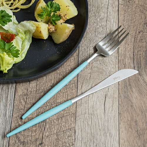 カトラリー / オシャレ / シンプル / かわいい / 北欧 【コンビニ受取対応商品】ポルトガル生まれのカトラリーブランド『Cutipol』 毎日の食卓が少しだけ華やかになりそうな素敵なカトラリーが仲間入りしました。 ポルトガル生まれのカトラリーブランド『Cutipol』から、細い柄と美しい曲線が特徴的なGOA/ゴアシリーズのテーブルナイフです。 シンプルなデザインはどんな食器とも相性抜群 GOAのカトラリーはそのシンプルさから、合わせる食器を選ばず、様々なシーンでお使いいただくことができます。中でも北欧食器との相性は抜群。テーブルにGOAが並ぶだけで、普段よりちょっぴりオシャレな雰囲気がただよいます。 普段使いはもちろん、ちょっとした来客時やホームパーティ等、シーンを選ばず様々な状況でお使いいただけるアイテムです。 デザインだけじゃない、計算された使いやすさ 『デザインは素敵だけど使いづらそう…』時折そんな声も聞こえてきますが、心配はご無用。クチポールの製品は人間工学に基づいて作られており、その見た目からは想像がつかない、驚くほど使い心地。 また持ち手部分にはアクセサリー等に用いられるレジンという合成樹脂を使用することで、女性の方にも使いやすい軽さを実現しています。 手に取った時の軽さや細さ、美しいラインを、ぜひ使って実感してみてください。 プレゼントにはディナー用3本セット(ナイフ、スプーン、フォーク)がオススメです。 < 3本セットはこちら 各種クチポールロゴ入りのギフトボックスも販売しております。 < ギフトボックス一覧 ■インフォメーション 商品名 GOA テーブルナイフ ブランド Cutipol/クチポール カラー ターコイズ×シルバー サイズ 23.1cm 材質 18-10ステンレス、樹脂 生産国 ポルトガル 備考 食洗機使用可 食洗機使用上の注意点 ・90℃以上の高温で洗うのはお控え下さい。 ・カトラリー同士の接触は傷の原因となりますので、狭いところにまとめて詰め込むのはお控え下さい。 ラッピング 対応可 (詳しくはコチラ) ■※クチポールをご購入前にご確認頂きたい注意点 クチポールの商品は素材の特性上、製造工程で生じる以下のような点がございますが、メーカーの品質基準をクリアし日本国内の正規代理店の検査基準を満たした商品になります。また、当店にて最終検品を行った製品をお客様にお届けしております。 (1)柄の部分に色ムラが見られる場合がございます。 (2)ロゴの刻印に潰れが見られる場合がございます。 (3)ステンレス部分にシミが見られる場合がございます。 (4)ステンレス部分に黒点が見られる場合がございます。(5)一つ一つ手作業で作られているため、長さや形状に個体差が見られる場合がございます。 画像をクリックして拡大(1)柄部分のムラ 画像をクリックして拡大(2)ロゴ刻印の潰れ 画像をクリックして拡大(3)ステンレス部分のシミ 画像をクリックして拡大(4)ステンレス部分の黒点 Cutipol GOAシリーズ ターコイズ×シルバー テーブルナイフ テーブルフォーク テーブルスプーン デザートナイフ デザートフォーク デザートスプーン コーヒースプーン