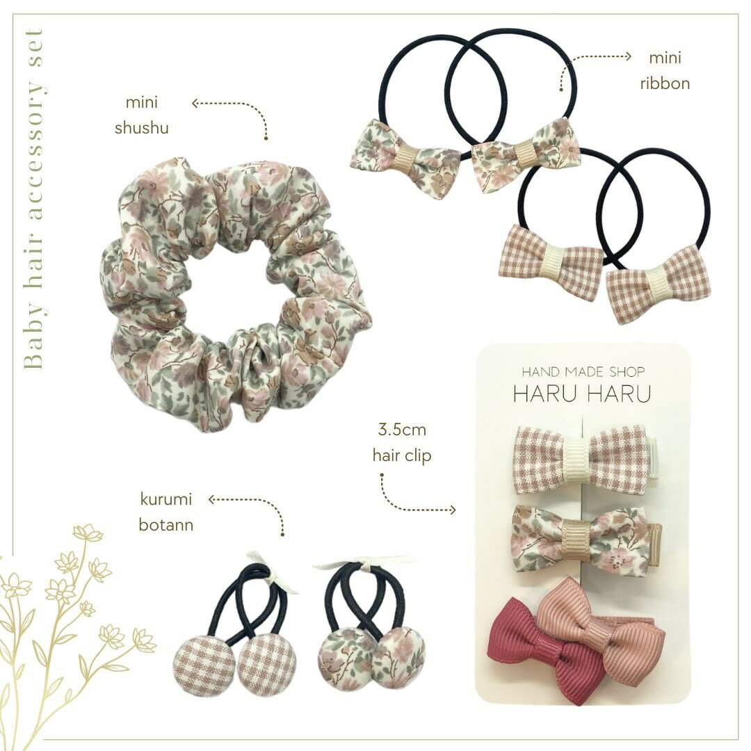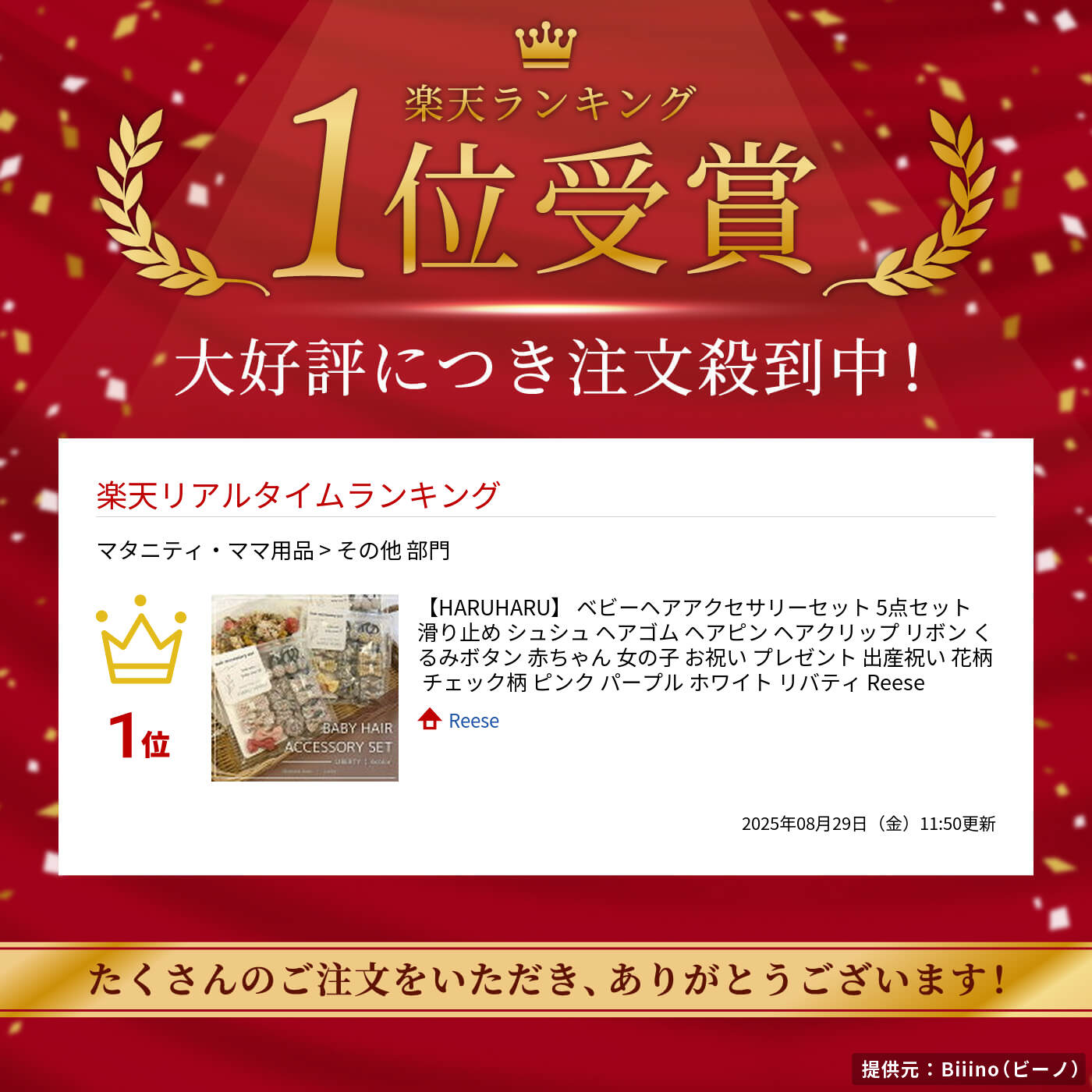 【HARUHARU】 ベビーヘアアクセサリーセット 5点セット 滑り止め シュシュ ヘアゴム ヘアピン ヘアクリップ リボン くるみボタン 赤ちゃん 女の子 お祝い プレゼント 出産祝い 花柄 チェック柄 ピンク パープル ホワイト リバティ Reese