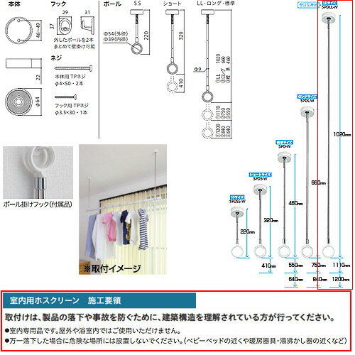 【セット内容】 SPD型[LLタイプ] 2本セット 【規格・特徴】 SPD型 LLタイプ 長さ:1020・1110・1200mm(3段階調節) 取付径:φ64mm 厚さ22mm リング部:外径φ54mm 内径φ39mm 1本あたり耐荷重:約8Kg 材質:本体 亜鉛ダイカスト(メッキ仕上) カバー ポリアセタール+ABS樹脂 ポール、スプリング ステンレス リング ナイロン ※受注生産商品です。納期は約2週間かかります。 【カラー】 ホワイト(W)のみ 【商品説明】 インテリアに調和するデザイン。使用しないときには取り外せてすっきりスマートなスポット型です。 差込口に広い傾斜面を施して、スムーズなポール装着が可能。 【ご注意】 製品を安全にお使い頂くためにもご理解下さい。 ■本製品は、室内専用です。 屋外や浴室に取付けてのご使用は出来ません。 ■耐過重15kg以内 ※天井保護のため。 ■本製品は塗装仕上げのため、金属などの硬質な物との接触は塗装がはがれる原因となるためご注意ください。 ■SPC型は水平〜2寸勾配(11.3度)未満まではそのまま取付けてご使用できます。 4寸勾配以上の傾斜天井の取付ける場合には「傾斜天井用パーツ」をご使用ください。 室内用物干し川口技研SPDLL-W-set