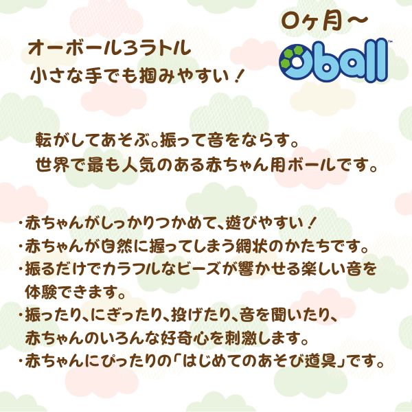オーボール 3ラトル ベビー ガラガラ 赤ちゃん ベビーボール おもちゃ 新生児 乳児 0ヶ月~ Oball 出産祝い 男の子 女の子 網状ボール ビーズ入り 2 KidsII オーボール3ラトル レッド オ-ボ-ルラトルレツド 赤ちゃん ファーストトイ おすすめファーストトイ 人気 知育玩具 オーボール 0歳 1歳 2歳 子供 音 掴みやすい 誕生日プレゼント 誕生日 出産祝い 男の子 男 女の子 女 赤ちゃん おもちゃ 定番 音が出る 掴みやすい 網状ボール ビーズ 0ヶ月から 音楽トイ ベビー 室内遊び ベビー用品 赤ちゃん用品 キッズ・ツー Kids2 オーボール3ラトル 新生児 0歳 1歳 2歳 ベビー 幼児 ボール ギフト キッズ オーボール 赤ちゃん玩具 プレゼント 音の出るおもちゃ ラトル ベビーボール クリスマスプレゼント プレゼント ギフト 出産祝いプレゼント 出産祝いギフト お祝い 贈り物 ギフト おもちゃ ストラップ クリップ ベビー ベビー ベッド おもちゃ ぶら下げ オーボールストラップ リング 赤ちゃん 吊るす 玩具 にぎにぎホルダー ベビーカーに取付 お外 kids2 キッズツー oball o-link 赤ちゃん おもちゃストラップ おもちゃホルダー ベビーカー おもちゃ ストラップ オーリンク オーボール 赤ちゃん 0ヶ月 0歳 新生児 ベビーカー ベビー 男の子 女の子 チェーン ホルダー トイプレイマット チャイルドシート1ヶ月 2ヶ月 3ヶ月 4ヶ月 5ヶ月 6ヶ月 7ヶ月 8ヶ月 人気 おすすめ おしゃれ 転がしてあそぶ。振って音をならす。世界で最も人気のある赤ちゃん用ボールです。・赤ちゃんがしっかりつかめて、遊びやすい!・赤ちゃんが自然に握ってしまう網状のかたちです。・振るだけでカラフルなビーズが響かせる楽しい音を体験できます。・振ったり、にぎったり、投げたり、音を聞いたり、赤ちゃんのいろんな好奇心を刺激します。・赤ちゃんにぴったりの「はじめてのあそび道具」です。対象年齢:0ヵ月~サイズ:直径約10×10×10cm 45g素材:ポリウレタン、ABS安全基準:CE、ASTMF963、食品衛生法 5