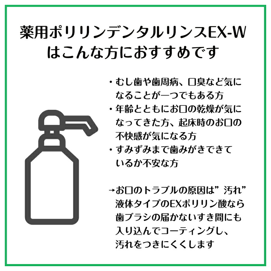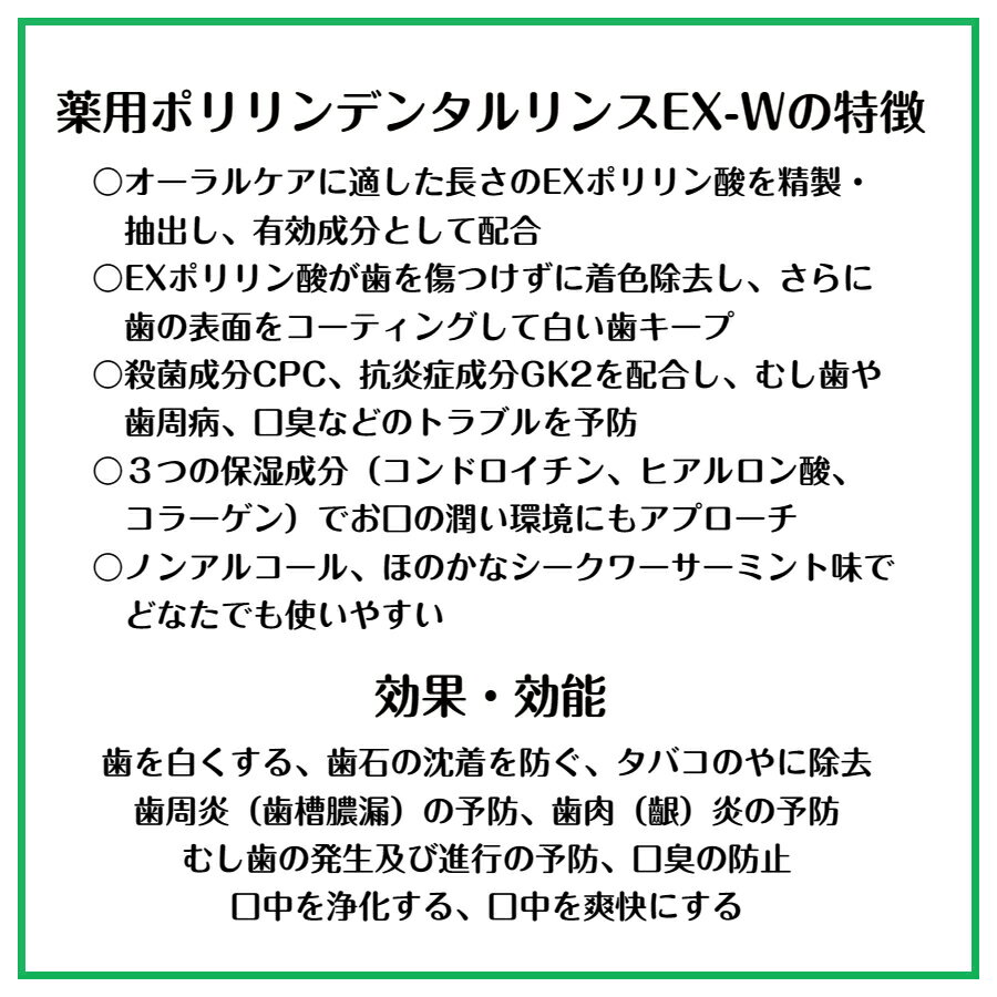 商品情報広告文責リジェンティス株式会社042-577-7777販売名薬用ポリリンデンタルリンスEX-W商品区分医薬部外品 薬用液体歯みがき内容量1100mL×2本(1日1回、1回あたり本体のポンプ4プッシュ=約12〜16mLのご使用で約4.4か月分)※本品(500mLボトル)の中身を使い切ってから、本製品を詰め替えてお使いください。包装仕様セキュリティロック付きスタンドパウチ袋入り製造販売元リジェンティス株式会社長野県岡谷市川岸西1-4-1生産国日本製効能・効果歯を白くする、歯石の沈着を防ぐ、タバコのやに除去、歯周炎(歯槽膿漏)の予防、歯肉(齦)炎の予防、むし歯の発生及び進行の予防、口臭の防止、口中を浄化する、口中を爽快にする。全成分◇湿潤剤:濃グリセリン、コンドロイチン硫酸ナトリウム、ヒアルロン酸ナトリウム(2)、加水分解コラーゲン液 ◇溶剤:プロピレングリコール、ポリオキシエチレン硬化ヒマシ油 ◇有効成分:ポリリン酸ナトリウム、塩化セチルピリジニウム、グリチルリチン酸ジカリウム ◇甘味剤:キシリトール ◇洗浄剤:メタリン酸ナトリウム ◇pH調整剤:クエン酸、クエン酸ナトリウム ◇保存剤:パラベン ◇着香剤:香料(シークワーサーミントタイプ)使用上の注意●内服液ではありませんので、飲み込まないでください。●高温、高湿、直射日光を避け、乳幼児の手の届かないところに保管してください。●目に入ったらこすらず、すぐに水で洗い流してください。●使用中、異常が現れた場合は使用を中止し、医師等に相談してください。詰め替え方など(パッケージ記載の内容)●必ず「薬用ポリリンデンタルリンスEX-W」の使用済みボトルにつめかえてください。●つめかえの際、ボトルやポンプは洗わずにご使用ください。●使い切ってからつめかえてください。水や他の製品が混ざらないようにしてください。●つめかえ後、本容器裏面右下の製造番号を控えておいてください。お問い合わせの際に必要な場合があります。リジェンティス 薬用ポリリンデンタルリンスEX-W 1100mL 詰め替え用 2個セット (医薬部外品液体歯みがき) EXポリリン酸 口内環境を整える 歯科医院 おすすめ 歯みがき ステイン除去 コーティング 歯周病 口臭 むし歯 お口の潤い ノンアルコール シークワーサーミント味 詰替 4.4本分 EXポリリン酸で口内環境を整え、歯周病などの口内トラブルを予防 薬用ポリリンデンタルリンスEX-Wはテレビ通販で発売開始から15年、累計販売数400万本突破のロングセラーブランド『薬用ポリリンシリーズ』の中でも人気の液体歯みがきです!毎日、家族で使うとあっという間に無くなってしまう!という方に、お得な詰め替えサイズの2個セットをご紹介します!本体(500mLボトル)の4.4本分です。有効成分EXポリリン酸が歯を傷つけず効率的に汚れを除去&コーティングして新たな汚れを付きにくくします。研磨剤不使用の液体タイプなのでEXポリリン酸が歯と歯のすき間や奥歯のまわりなど歯ブラシが届きにくい部分にも行き届いてコーティングします。EXポリリン酸に加えて殺菌成分CPCや抗炎症成分GK2*、さらに3種の潤い成分も配合していますので、口内を清潔に保つことでむし歯や歯周病などのお口のトラブルを防ぎ、お口の潤いもキープして気になる口臭も予防します。ノンアルコールタイプのほのかなシークワーサーミントの香りで(※酸味はありません)使用後はスッキリしますので、お子様から大人までどなたにもお使いいただけます。*CPC=塩化セチルピリジニウム、GK2=グリチルリチン酸ジカリウム、いずれも有効成分として配合 EXポリリン酸が口内の好循環にアプローチ 液体タイプだからすき間にも届いてコーティング 殺菌&抗炎症成分+潤い成分で歯周病・口臭も予防 いつまでも自分の歯で美味しい食事を楽しみたい! 1本で色々なお口の悩みをケアしたい! 毎日使うものだから、少しでもお得がいい! リジェンティスストア楽天市場店にお越しいただき、ありがとうございます。この「薬用歩リリンデンタルリンスEX-W」は、歯科でも注目の成分『EXポリリン酸』を配合した薬用液体歯みがきです。【EXポリリン酸とは?】EXポリリン酸は色々な長さ(サイズ)のものが混じったポリリン酸の中からステイン除去とコーティングに効果を発揮するサイズだけを独自技術により抽出したもので、分割ポリリン酸よりもさらに効果を高めた特別な成分です。分割ポリリン酸と同様にEXポリリン酸もリジェンティス株式会社にしか作れないオリジナル原料です。【EXポリリン酸のはたらき】EXポリリン酸は歯を傷つけずに汚れを除去すると同時に、歯の表面をコーティングすることで新たな汚れを付きにくくします。毎日のケアによって《汚れが付きにくいから、次の歯みがきで汚れが落ちやすい》口内の好循環を作ることで、口内を清潔に保ちます。【使い方】本体ボトルのポンプ4プッシュ程度(約12〜16mL)をお口に含んで約20秒間すすぎ、吐き出してからブラッシングを行った後、水などで口をすすぎます。朝のネバツキが気になる方は
