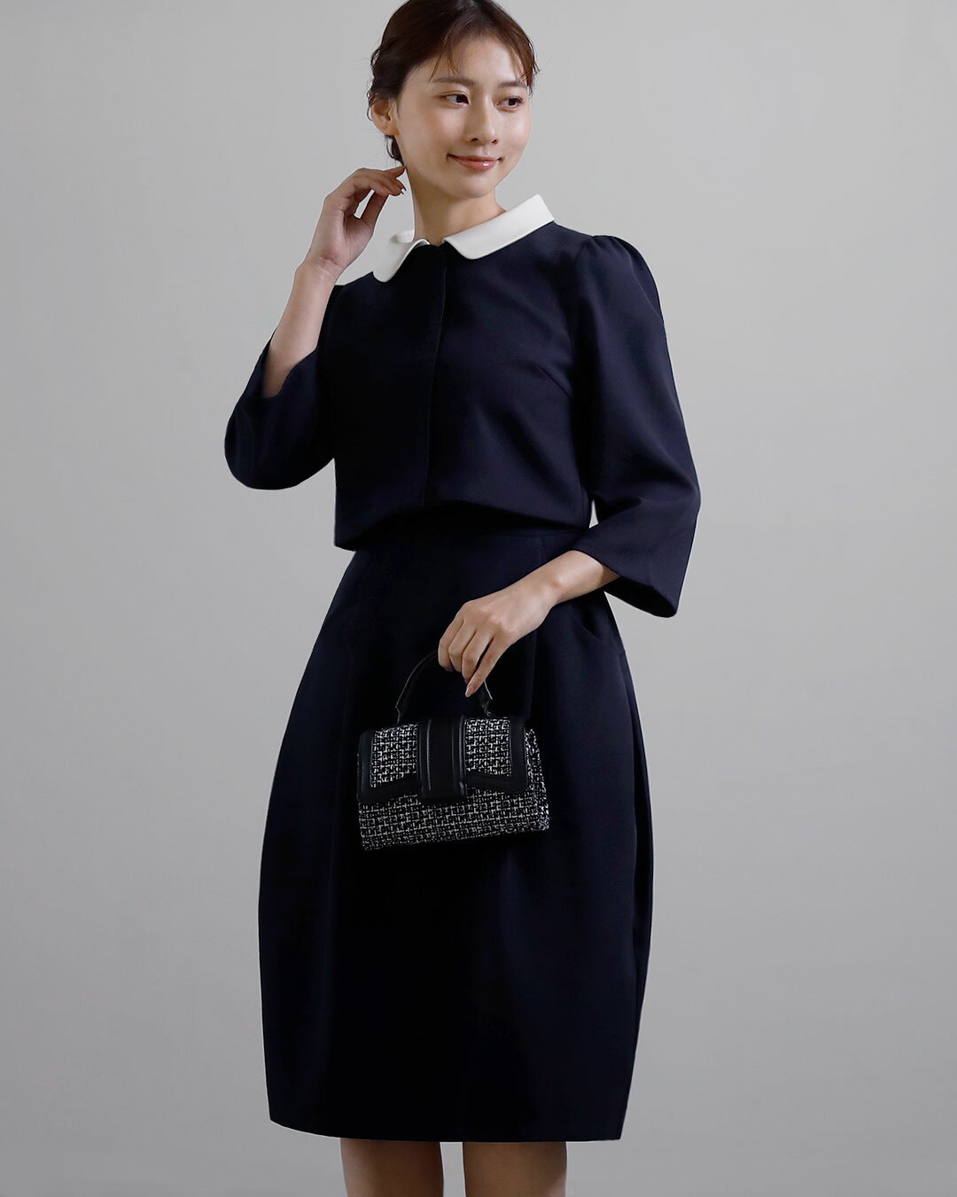 Kirei series Kirei Set-up Sarah スタッフ 着用コメント < 小柄さん > 骨格タイプ:ウェーブ (華奢で柔らかなライン) 身長:149cm 体重:43kg バスト:81cm ウェスト:60cm 通常:SS/S 着用サイズ:36(SS)〜38(S) 着丈:膝が完全に隠れる バスト周り:余裕がある ウエスト周り:余裕がある 全体的に余裕があり、ストレスなく着用できます。華奢なラインを邪魔せず、ふわりとしたシルエットが上品。ジャケットは他のワンピースに羽織ってもきちんと感が出るので、セレモニーにも活躍しそうです。 < 平均さん > 骨格タイプ:ナチュラル (フレーム感があり骨格しっかり) 身長:158cm 体重:47kg バスト:83cm ウェスト:62cm 通常:S 着用サイズ:36(SS)〜38(S) 着丈:膝が隠れる バスト周り:余裕がある ウェスト周り:余裕がある ジャケット袖はゆったりめで、今っぽさとリラックス感。白襟を外せばシーンに合わせて着回しでき、スカートはゴム仕様で楽ちん。オフィスにも休日のお出かけにも使いやすいです。 < 長身さん > 骨格タイプ:ストレート (立体的でメリハリのある体つき) 身長:167cm 体重:51kg バスト:84cm ウェスト:68cm 通常:M/L 着用サイズ:40(M)〜42(L) 着丈:膝が隠れる バスト周り:余裕がある ウェスト周り:余裕がある 短め丈のジャケットはバランスが取りやすく、長身でもすっきり。直線的なラインが強調され、きちんと感が際立ちます。スカートのシルエットも綺麗で、長時間の式典や立食パーティーでも快適です。 < グラマーさん > 骨格タイプ:ウェーブ寄りナチュラル (骨感はあるけれど柔らかライン体型) 身長:162cm 体重:62kg バスト:92cm ウェスト:78cm 通常:L/LL 着用サイズ:40(M)〜42(L) 着丈:膝が隠れる バスト周り:程良いフィット感 ウェスト周り:程良いフィット感 程よいフィット感がありつつ締め付けはなく、長時間でも楽。柔らかな素材が女性らしいシルエットを作り、白襟を外すと雰囲気も変化。記念日やフォーマルなシーンにも安心して選べます。 ※参考コメントのため、必ず[実寸値]をご確認ください。 カラー バリエーション 神戸 Navy 上品で知的な印象のクラシックネイビー ▽ より映えるのはこのタイプ ▽ [ ブルべ冬(ウィンター)さん ]・濃くクリアな寒色で透明感が際立ちます。・白襟とのコントラストで顔まわりをシャープに見せます。 美人 Black 清楚さと上品さを兼ね備えたシックブラック ▽ より映えるのはこのタイプ ▽ [ ブルべ冬(ウィンター)さん ]・黒と白の強いコントラストが凛とした印象に。・フォーマルなシーンでも気品を損ないません。 アイテム ディテール 頼れる着回し力4wayセットアップ ■着回し自在 4wayセットアップ白襟の有無で印象チェンジ。トップス・スカートを単体でも使えて、シーンを問わず活躍します。 ■清楚にお顔映え 魔法の白襟取り外し可能な白襟が顔まわりを明るく見せ、行事やセレモニーにも安心。 ■華奢見せ ゆったり七分袖ゆったりとした袖で動きやすく、さりげなく腕を華奢見えに。 ■ディテールセットアップ / 白襟 / 襟付き / 七分袖 マテリアル 肌触り・伸縮・お家洗い可プレミアム「9-Stretch」 上質な肌触りと美しいフレアを生むほどよいハリ、高い伸縮性に加え、ご自宅での洗濯も可能。※色移り防止のため、白襟は必ず本体から外して別洗いをしてください。<Attention>※お洗濯は、弊社推奨方法をご覧ください。 サイズスペック(単位:cm) サイズ区分 36(SS)〜38(S)40(M)〜42(L) トップス着丈(襟下から)4042 スカート総丈7072 肩幅3537 バスト9098 スカートウェスト6674 アームホール2123 袖丈4547 トップス重量260g290g スカート重量350g380g 表地ポリエステル95%/ポリウレタン5% 裏地ポリエステル100% 伸縮性あり 透け感なし ポケットスカートあり 製造中国 <Attention> ・サイズは当店平置き実寸です。・生地特性上、1〜2cmの誤差が生じる場合がございます。・測り方はこちらをご覧ください。・タンブラー乾燥はお避けください。・お問い合わせ:rakuten@reginarisurre.com
