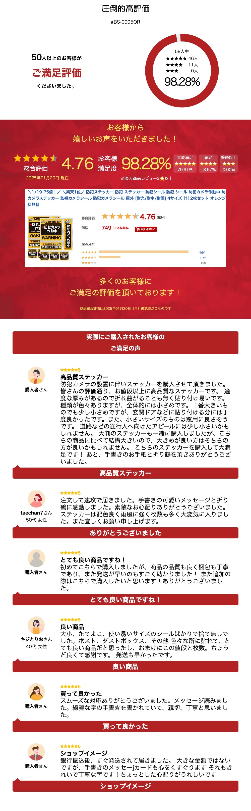 \楽天1位/ 防犯ステッカー 防犯 ステッカー 防犯シール 防犯 シール 防犯カメラ作動中 防犯カメラステッカー 監視カメラシール 防犯カメラシール 屋外 [耐光/耐水/耐候] 4サイズ 計12枚セット オレンジ 送料無料 【色の専門家とプロデザイナー】プロデュース 選べる3種 ★あらゆる視点で防犯を意識した選べる3選!防犯効果が期待できる色の組合せと警告を伝えるデザインを融合しました。背景には市場調査やモニター調査・アンケート調査で収集した豊富なデータを活用し、防犯上、効果が発揮できるようコンセプト3種を決定し製作しております。お客様へ安全と安心をお届けできる防犯ステッカーを製作いたしました!★品質へのこだわり:(1)耐光性インク採用 耐光性インクは紫外線に強く、色褪せしにくいことが特徴です。水にも溶けないので屋外環境に適しています。(2)ヘアライン光沢マット採用 厚みのあるヘアライン光沢マットは金属感や高級感があり、防犯意識の高さを伝えることができます。(3)強粘着糊採用 強粘着糊は屋外の厳しい環境にも対応します。 ※:ステッカーの経年劣化は、使用環境により異なります。★サイズ:12×12(2枚)、5×12(2枚)、17×5(2枚)、5×5(6枚) 玄関ドアや事務所入り口、ガレージ、ポスト、表札柱、ゴミ置場、エレベーター前など、さまざまな場所に適用できる4種類の大きさのステッカーをご用意しました。★カラー:深めのオレンジ・赤・黒を使用しています。★インバウンド増加に伴う防犯対策としても効果的です。大切な方の安全・安心のため、まずはお気軽にできる防犯対策としてお勧めです。★90日間の品質保証をつけさせていただきました。返品・返金につきましては、迅速・丁寧にご対応いたしますのでご安心ください。 5