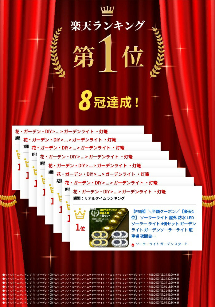 上の画像タップでソーラーライトって何かが丸分かり! 商品情報メーカーAZ4U製品名ソーラーライト 屋外 ガーデンソーラーライト 4個セット LED 白色 暖色(黄色) 使用方法屋外のガーデンや駐車場、バルコニーなどに設置を想定ソーラー充電の為、ソーラーライトは電源不要周囲が明るいときは点灯し、暗くなったら自動で点灯防水機能がある為、雨の日も設置可能発光時間6〜10時間 ※日照条件によって前後します素材PC+ABS樹脂防水・防塵性能IP55使用方法ソーラーライト充電で電源や配線は不要です。本体裏面のON/OFFスイッチをONにして太陽に当てて充電してください。自動で夜間点灯し充電を使い切り自動で消灯いたします。柔らかい暖かみのある光がお庭を照らし癒しの空間を演出致します。程よい光は眩しすぎずご近所様への配慮も防犯にも最適。設置想定お庭に直接置いたり、土や砂利にそのまま埋め込んでください。窓際や屋外テラスのテーブルなどに直接置いてご使用ください。インターロッキングの隙間に埋め込み、駐車場の誘導灯としてご使用ください。自動点灯/消灯光センサーにより、昼間は消灯・充電暗くなると自動で点灯します。※街灯など強い光があたらない場所でご使用下さい。性能4〜6時間日中充電→8〜10時間夜間点灯仕様セット個数:4個製品サイズ :直径12 cm防水等級 : IP55光源数: 12 LED発光色:暖色/白色ご注意モニターの設定によって色合いが異なって見える場合があります。またデザインや仕様などは改良のため予告なく変更する場合があります。予めご了承くださいませ。※お問い合わせを頂きますが、当店はリュウカ ガーデニング様とは無関係です。関連用語ソーラーライト 屋外 ガーデンライト ガーデニングライト 車で踏んでも大丈夫 演出 防犯 外灯 イルミネーション 照明 埋め込み式 置き型 エントランス 一軒家 庭 庭園 ベランダ 花壇 テラス 歩道や車道 カーポート 芝生(埋め込み) 駐車場 各種イベントのライトアップ お店のライトアップ 屋外 防水 分離型 庭 日陰 ツリー 屋外 吊り下げ 屋外 吊り下げ スポットライト 屋外 高輝度 ハンギング 屋外 バルコニー 冬 屋外 屋外 埋め込み式 ガーデン 置物 低電圧 明暗センサーランキング楽天 (楽天市場)ランキングはこちらスタート楽天市場ランキングはこちら \迷ったらここ!/人気 楽天 ランキングAZ4U ソーラーライト 屋外 防水 ガーデンソーラーライト LED ソーラー ライト 4個セット ガーデンライト 駐車場 ライト LEDガーデンライト クリスマス ハロウィン ベランダ センサーライト 庭 防犯 イルミネーション 明るい 置き型 埋め込み 自動点灯 クルマ エクステリア ソーラーライト屋外 ソーラーガーデンライト 工事現場 誘導灯 持ち運び フェンス ガーデニング おしゃれ プランター 外灯 ランタン キャンプ ライトアップ 花壇 円形 かわいい 外構照明 上の画像タップでソーラーライトって何かが丸分かり! 屋外を照らすガーデンソーラーライト ソーラーライト ガーデンライト エクステリアに ソーラーライトは屋外を美しく照らす理想的な選択肢。クリスマスやハロウィンの飾りつけにもピッタリ!防水性能はIP55で、雨や風にも対応し、耐久性に優れています。ソーラーライト・ガーデンライトは、電源や配線が不要で、太陽光で自動的に充電。昼間は消灯し、暗くなると自動的に点灯します。明るすぎず、程よい温かみのある光を放射し、近隣への配慮や防犯にも適しています。ソーラーライトは庭に直接置いたり、土や砂利に埋め込んで使用でき、窓際や屋外テラスのテーブルにも置けます。駐車場の誘導灯としても活用可能です。日中は屋外や窓際など日が当たるところで充電し、夜間は室内の間接照明としても利用l可能。この製品にはソーラー充電式のバッテリーが内蔵されており、1回の充電で8〜10時間の点灯が可能。LEDライトを使用しており、寿命が長く、環境にも優しい商品。電球色はエクステリアにぴったりな白と黄色の2種類。直径12cm。階段に並べて置いたりするのもお勧め。保証期間はお届けより120日。イベントなどでソーラーライトやガーデンライトをお考えの方、高価なレンタル品よりこちらの方がお得にご用意できますよ! 外構照明 ※お問い合わせを頂きますが、当店はリュウカ ガーデニング様とは無関係です。 電源不要のソーラーライト 暖かい光でお庭をおしゃれに! 持ち運びかんたん!キャンプにも! 1 \迷ったらここ!/人気 楽天 ランキング