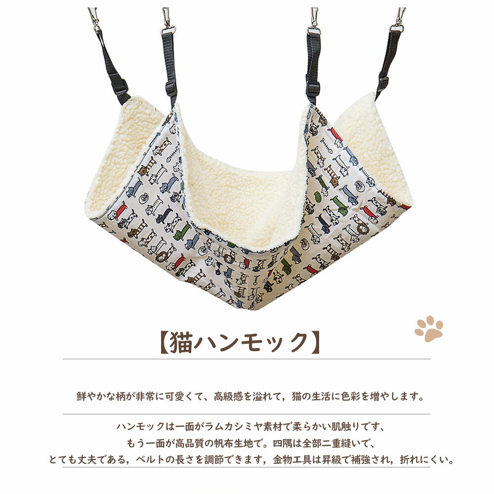 1.【冬夏両用】冬夏両用の猫ハンモック、高品質の金具を採用して、優れた安定感を提供しており、8kgまでの荷重に耐えられます。展開 サイズ: 約37cm x 48cm。 2.【優れた素材】このハンモックは一面が柔らかい素材で暖かい肌触りで、ふわっふわの暖かい冬用です。もう一面がキャンバス生地で、通気性に優れていて、暑い夏用です。丈夫で猫の引っかきを耐えられます。猫はもちろん、小型犬、ウサギなどにも適用します。 3.【調節可能】 四つのストラップにベルトバックルが採用されています。ベルトの長さが取り付け場所やケージのサイズにより調節可能です。 4.【取り付簡単】 フックで簡単にケージに取り付けられます。ケージのほかに椅子やテーブルの下にもご利用いただけます。猫ちゃんの好きなくつろぎスペースが簡単に作れます。 5.【洗う可能】何回も洗って繰り返し使え、いつでも清潔、キレイに保持できます。(ご注意、フックが金属ですので、手洗いか洗濯ネットのご使用をお勧めします)。 メーカー希望小売価格はメーカーサイトに基づいて掲載しています