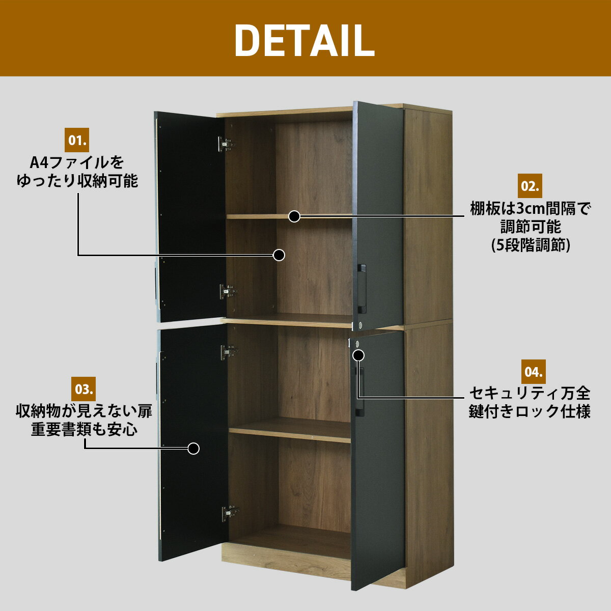 配送について 送料 無料 (北海道・沖縄・離島・一部地域見積り) ●商品詳細 -infomation- 商品名 ナートル(オフィス)【Natore】 サイズ 幅80×奥行41.5×高さ177(cm) ※個体差により若干の差異あり 材 質 メラミン塗装 パーティクルボード・強化ガラス 重 量 約75kg 耐荷重 【棚板】各20kg 梱包サイズ 【梱包1】約幅100×奥行43×高さ18.5(cm)【梱包2】約幅92×奥行45×高さ18.5(cm) 総重量(梱包材含む) 【梱包1】40kg【梱包2】38kg 備 考 ※他商品との同梱は出来かねます。 ※組み立て方や個体差により、サイズ表記と多少の差異が生じる場合がございます。 ※ご使用のモニターやディスプレイ等の環境によって、実際の明るさや色と多少異なって見える場合がございます。 ※その他、記載事項ご確認の上ご注文ください。 【当店の家具・インテリアについて】 お客様に自信を持って、おすすめできる商品のみ取り扱っております。 高い技術があるからこその洗練されたデザインが特徴です。 ソファ、ベッド、ダイニング、デスク、テレビ台など、豊富に取り揃えております。 ランキング上位商品、人気商品、お得な訳ありアウトレット商品、 お買い得な値引き・割引き・セール商品、ポイント変倍商品はお問い合わせが多く、 数に限りがありますので、お早目にお買い求めください。 あす楽配送の即日発送(即納)商品もございますので、急なご入用にも出来る限り対応させていただきます。 【DORIS家具の特徴】 日々の暮らしに役立つものをシンプルなものから個性的なものまで幅広く取りそろえ、 年代、性別、利用シーンにとらわれず、誰もが手軽に取り入れられる家具をコンセプトに、 リラックスシーンからビジネスシーンまでお使いいただける商品を提供しております。 【セット商品について】 ソファとテーブルセット、デスクと収納セット、ダイニングセット等のセット商品もございます。 お部屋の広さやシーンに応じたセットをご用意いたしました。 【使用用途 ※以下のようなシーンでご使用いただけます。】 モダン カントリー インダストリアル ナチュラル 北欧モダン シンプル ミッドセンチュリーアンティーク クラシック コースタル 海岸風 アジアン モロッコスタイル シャビーシック カントリー調 和モダン 和風 姫系 フェミニン 【対象 ※以下のような方に多くご利用いただいております。】 年代:20代 30代 40代 50代 60代 70代に対応しております。 ひとり暮らし 一人暮らし ファミリー 家族 メンズ 男性向け レディース 女性向け キャリア世代 ヤング ミドル ミセス アダルト シルバー シニア世代 お嬢様 娘様 お嫁様 奥様 お母様 お義母様 御祖母様 お孫様 【贈り物に ※以下のような節目や祝い事でのプレゼントとしてもご好評いただいております。】 新社会人 新成人 結婚祝い 成人祝い 就職祝い 誕生日 母の日ギフト 父の日ギフト クリスマス 新生活ツートンカラーがおしゃれな収納 よく見かける白黒の無機質な収納とは一味違う黒×木目のおしゃれな収納です。 「オフィスをワンランク上の素敵な空間にしたい」「堅苦しくないカジュアルオフィス空間を目指している」「お家で他の家具との調和のとれるおしゃれな大型収納を探している」という方にぴったりの収納です。 A4サイズも余裕で収納できるサイズ感 最もポピュラーなA4サイズはもちろん、少し高さのある書類や書籍にも対応できる絶妙なサイズ感となっております。 奥行きもしっかりあるので、横に並べても積み重ねても収納が可能です。 大容量の収納スペース 中央の棚板は固定ですが、上下の棚は可動棚になっているので用途に応じて、調整してご使用いただけます。 ※上下の稼働棚は取り外し可能ですが、扉との建付けの兼ね合い上、必ず設置してご使用ください。 3cm間隔で調整できる棚板 「棚がもう少し高かったら/低かったら良いのにな」という経験はございませんか? こちらの収納は棚板を3cm間隔、5段階調整することができます。 お手持ちの収納物にぴったりのサイズに調整してきれいに収納することができます。 収納物を守る扉 透けない扉なので、重要書類など外から見えてほしくないものを収納するのに適しています。 プライバシー保護もできて安心安全です。 鍵付きでセキュリティ対策 大事な書類やもの収納する際に選びたい鍵付き収納。 上下どちらも鍵をかけられるのはうれしいポイントです。 ※鍵は別売りしておりませんのでお取扱いにご注意ください。 同シリーズの収納と合わせて素敵なカジュアルオフィス 統一感のあるおしゃれなオフィスだと出社が楽しくなりますね。 落ち着いた色味できちんと感もありつつカジュアルで快適な職場を作ることができます。 ※写真は同シリーズの収納とコーディネートしております。ページ下のリンクも合わせてご覧ください。 おすすめの関連商品はこちらRECOMMEND 2段2列タイプ 2段3列タイプ 4段2列タイプ 配送について 送料 無料 (沖縄・離島・一部地域見積り)
