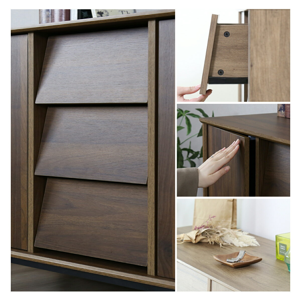 配送について 送料 無料 (沖縄・離島・一部地域見積り) ●商品詳細 -infomation- 商品名 エリアス120cm(キャビネット・シェルフ)【Elias120cm】 サイズ 幅120×奥行40×高さ81.5(cm) ※個体差により若干の差異あり 材 質 パーティクルボード スチールパイプ 重 量 約40kg 耐荷重 天板:30kg引き出し:各5kg可動棚板:各10kg固定棚板:各15kg 梱包サイズ 梱包1:約幅125×奥行43×高さ8(cm)梱包2:約幅70.5×奥行42.5×高さ16.5(cm) 総重量(梱包材含む) 約42.5kg 備 考 ※他商品との同梱は出来かねます。 ※組み立て方や個体差により、サイズ表記と多少の差異が生じる場合がございます。 ※ご使用のモニターやディスプレイ等の環境によって、実際の明るさや色と多少異なって見える場合がございます。 ※その他、記載事項ご確認の上ご注文ください。 【当店の家具・インテリアについて】 お客様に自信を持って、おすすめできる商品のみ取り扱っております。 高い技術があるからこその洗練されたデザインが特徴です。 ソファ、ベッド、ダイニング、デスク、テレビ台など、豊富に取り揃えております。 ランキング上位商品、人気商品、お得な訳ありアウトレット商品、 お買い得な値引き・割引き・セール商品、ポイント変倍商品はお問い合わせが多く、 数に限りがありますので、お早目にお買い求めください。 あす楽配送の即日発送(即納)商品もございますので、急なご入用にも出来る限り対応させていただきます。 【DORIS家具の特徴】 日々の暮らしに役立つものをシンプルなものから個性的なものまで幅広く取りそろえ、 年代、性別、利用シーンにとらわれず、誰もが手軽に取り入れられる家具をコンセプトに、 リラックスシーンからビジネスシーンまでお使いいただける商品を提供しております。 【セット商品について】 ソファとテーブルセット、デスクと収納セット、ダイニングセット等のセット商品もございます。 お部屋の広さやシーンに応じたセットをご用意いたしました。 【使用用途 ※以下のようなシーンでご使用いただけます。】 モダン カントリー インダストリアル ナチュラル 北欧モダン シンプル ミッドセンチュリーアンティーク クラシック コースタル 海岸風 アジアン モロッコスタイル シャビーシック カントリー調 和モダン 和風 姫系 フェミニン 【対象 ※以下のような方に多くご利用いただいております。】 年代:20代 30代 40代 50代 60代 70代に対応しております。 ひとり暮らし 一人暮らし ファミリー 家族 メンズ 男性向け レディース 女性向け キャリア世代 ヤング ミドル ミセス アダルト シルバー シニア世代 お嬢様 娘様 お嫁様 奥様 お母様 お義母様 御祖母様 お孫様 【贈り物に ※以下のような節目や祝い事でのプレゼントとしてもご好評いただいております。】 新社会人 新成人 結婚祝い 成人祝い 就職祝い 誕生日 母の日ギフト 父の日ギフト クリスマス 新生活美しい木目調と引き出しの傾斜デザインの組み合わせがおしゃれな木製キャビネット「エリアス」。高級感のある佇まいながら、使いやすさを考慮した充実の収納スペースを完備しています。どんな空間にも調和しやすい北欧テイストで、生活感をしっかりと隠しながらお部屋に上質な雰囲気をプラスします。 プッシュ扉収納 左右の扉にはワンタッチで開閉できるプッシュ扉を採用し、使いやすさも抜群です。扉の奥には高さを変えられる2枚の可動棚付き収納を完備し、収納アイテムに合わせて約3cm間隔・3段階で細かく高さ調整ができます。 おしゃれな傾斜デザイン 中央の引き出しは3連になっており、かさばる小物やきちんとしまっておきたいアイテムを差別化して収納することができます。傾斜のあるデザインが特徴的で、使いやすさだけでなくデザイン性にもこだわりました。 たっぷり収納しても扉を閉めれば見た目はすっきり美しい、機能性にも優れたキャビネットです。 置き場所を選ばないシンプルなキャビネット スタイリッシュで美しい木目柄が際立つ「エリアス」は、どんな空間にも調和し、上品で落ち着いた雰囲気を演出します。モダンなインテリアからナチュラルな空間まで幅広くマッチし、リビングや寝室のサイドボードとして、書斎用本棚として、さまざまな空間で活躍します。 テイストの合った高級感のある木目調のインテリアと組み合わせることで、お部屋の雰囲気をワンランクアップさせます。※テレビボードの商品ページは下記をご覧ください。 天板にはお気に入りのアイテムや照明などを置いて、ディスプレイ棚としてもお楽しみいただけます。 配送について 送料 無料 (沖縄・離島・一部地域見積り)