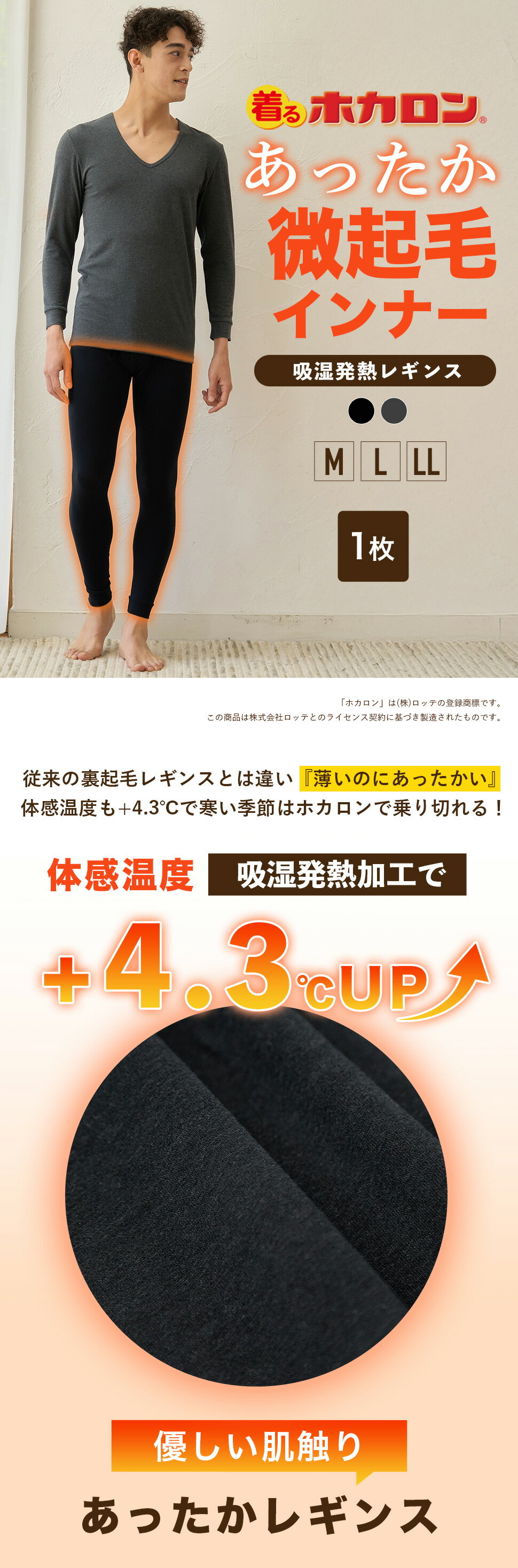 【最大20%OFFクーポン!11/14 10:00〜11/26 23:59】着るホカロン メンズ 綿 レギンス 1枚 裏微起毛 リニューアル ブラック Mサイズ Lサイズ 男性 インナー メンズインナーレギンス メンズシャツ 男性用シャツ 肌着 防寒着