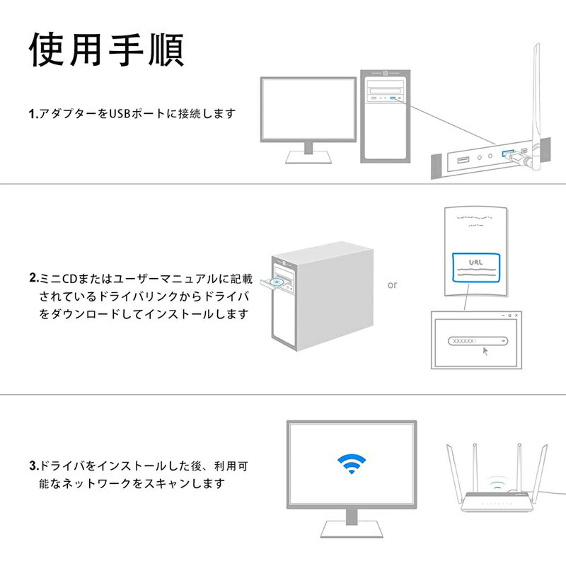 【USB3.0ポート搭載・超高速通信】 USB3.0接続により、USB2.0の約10倍の転送速度を実現。 802.11ac技術に対応し、より安定した高速インターネット接続を提供します。 オンラインでのHD動画視聴、オンラインゲーム、大容量ファイルの転送やダウンロードなども快適。 Bluetooth機能も搭載しており、大容量データを短時間でスムーズに転送できます。 【5dBi高感度アンテナ・広範囲通信】 2.4GHz(300Mbps)+5GHz(867Mbps)のデュアルバンド対応、最大1300Mbpsの高速通信を実現。 障害物の多い環境でも安定したWi-Fi接続が可能です。 可動式の5dBi高増幅アンテナを採用し、広範囲で安定した信号を送受信。 離れた部屋でもしっかり通信できます。 ※Wi-Fi6(802.11ax)には対応していません。 【無線LAN+Bluetooth 2in1機能】 Wi-FiとBluetoothを同時に使用可能。 apt-Xコーデック対応で、高音質なワイヤレス通信を実現します。 Bluetoothの通信距離は約10~20m(環境や接続機器により異なります)。 ご使用のPCに既にBluetoothが搭載されている場合は、競合を避けるために内蔵Bluetoothを無効にしてください。 【幅広い対応OS&安心保証】 Windows XP / 7 / 8 / 8.1 / 10 / 11 に対応。 Mac OSは非対応です。 ご使用中に不明点や不具合がある場合は、いつでも弊店までご連絡ください。 また、コンピュータの自動更新後は、ドライバを最新バージョンに更新してください。 更新を行わないと動作しない場合があります。