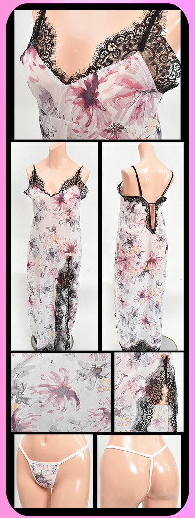 ベビードール 「お花プリントのシフォンレース ベビードール セクシーショーツ セット Tバックショーツ ・ キャミソール BD 」 セクシー ランジェリー 下着 ルームウェア スリップ インナー レディース ロング丈 フリーサイズ ホワイト[[BBr-B-7009]]