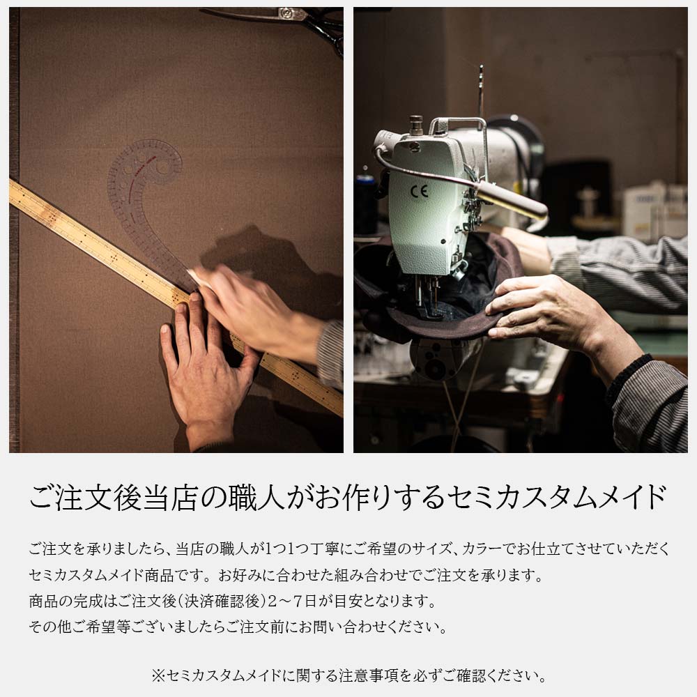 商品詳細 ブランド REPression Hatters(リプレッションハッターズ) 商品名 コットンリネン 綿麻 ラージクラウンクラウン セミオーダー ハンチングキャスケット ボディカラー ブラック チャコールグレー ネイビー ロイヤルブルー ブラウン ベージュ グリーン マスタード ホワイト 裏地カラー ブラック チャコールグレー ライトグレー ネイビー ブルーグレー ブラウン アイボリー グリーン カーキ ワインレッド サイズ 55cm 57cm 58cm 59cm 60cm 61cm 62cm 63cm つばの長さ 約6cm 深さ 浅い やや浅い 普通(約10.5cm) やや深い 深い 素材 表地 綿85% 麻15% 裏地 ポリエステル100% 原産国 日本製 素材の厚さ 薄手 やや薄手 普通 やや厚手 厚手 素材の硬さ 柔らかい やや柔らかい 普通 やや硬い 硬い おすすめご利用季節 夏 春 秋 冬 商品について コットンリネン(綿麻)素材を使用したREPression Hattersオリジナルのハンチングキャスケット。 9色から選べるコットンリネンは耐久性、吸湿性、吸水性に優れ、軽くて風通し抜群。 春夏秋の3シーズンでのご利用がおすすめです。 サイズ、ボディカラー、裏地のカラーをご希望で当店の職人が1つ1つ丁寧にお仕立てするセミオーダー商品です。 クラウンは大きめの膨らみでユッタリ被るラージクラウン。 スベリには、防臭、抗菌、速乾、吸汗機能のあるシルリードを採用。 裏地にはしなやかでサラリとした肌触りの良さがあり、上品な光沢で高級感があるポリエステル生ツイルを使用。 トップ部分にはブランドロゴが入ったポマードガードで汗や整髪料の汚れが表に出にくい仕様となっております。 サイズは55cm~63cmをご用意致しました。1cm刻みで大きいサイズから小さいサイズまでご対応いたします! 商品に関するご相談不明な点などございましたら、お気軽にお問い合わせください。 洗濯表示春夏にお勧めのコットンリネン(綿麻)のハンチングキャスケット。 2003年創業のREPression Hattersでボディカラー、サイズ、裏地をお好みでセミオーダー! 大きめの膨らみでユッタリ被るラージクラウンハンチングキャスケット。 REPression Hatters(リプレッションハッターズ) コットンリネン 綿麻 ラージクラウン セミオーダー ハンチングキャスケット 55cm~63cm 商品について コットンリネン(綿麻)素材を使用したREPression Hattersオリジナルのハンチングキャスケット。 9色から選べるコットンリネンは耐久性、吸湿性、吸水性に優れ、軽くて風通し抜群。 春夏秋の3シーズンでのご利用がおすすめです。 サイズ、ボディカラー、裏地のカラーをご希望で当店の職人が1つ1つ丁寧にお仕立てするセミオーダー商品です。 クラウンは大きめの膨らみでユッタリ被るラージクラウン。 スベリには、防臭、抗菌、速乾、吸汗機能のあるシルリードを採用。 裏地にはしなやかでサラリとした肌触りの良さがあり、上品な光沢で高級感があるポリエステル生ツイルを使用。 トップ部分にはブランドロゴが入ったポマードガードで汗や整髪料の汚れが表に出にくい仕様となっております。 サイズは55cm~63cmをご用意致しました。1cm刻みで大きいサイズから小さいサイズまでご対応いたします! 商品に関するご相談不明な点などございましたら、お気軽にお問い合わせください。 REPression Hatters(リプレッションハッターズ) 2003年創業、東京都町田市に店舗を構える帽子専門店REPression Hatters。 裁断、縫製、加工など製帽に関するすべての工程を店舗兼アトリエにて行っています。 年間約500点以上のオーダーメイド、自社ブランド「The Skilled Workers」の製作、 国内外のOEMなども行っております。 ポイント