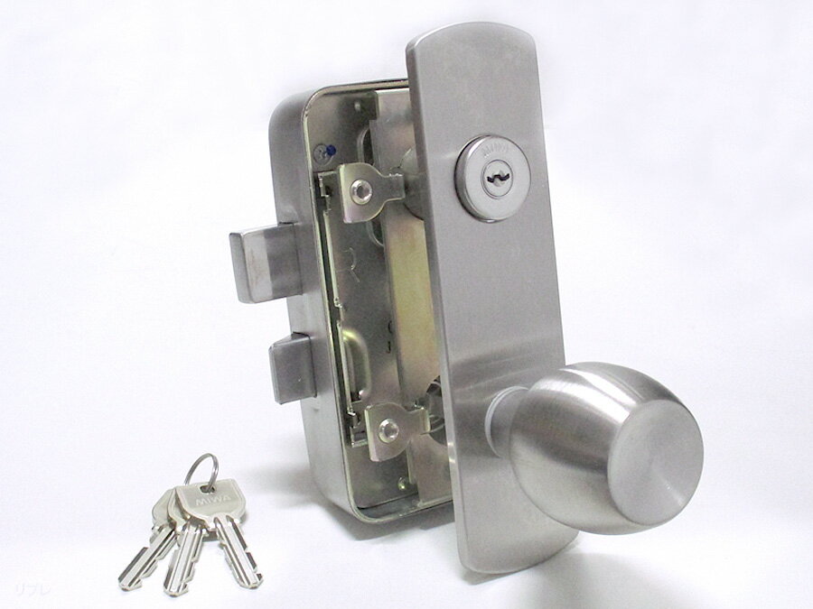 ミワロックRA(85RA)用の取替用本体セットの握玉タイプです。 外開ドアの右勝手用(ドアの外側から見て蝶番が右、鍵が左)。 色はシルバー色、子鍵3本付 (更に追加のコピーキーがご入用の場合はこちらへお願いいたします)。 扉厚35~38ミリに対応。 ⇒ レバーハンドルタイプはこちら ⇒ RAシリンダー交換説明書はこちらU9RA(85RA)取替用本体セット 握玉タイプ外開用右勝手シルバー色
