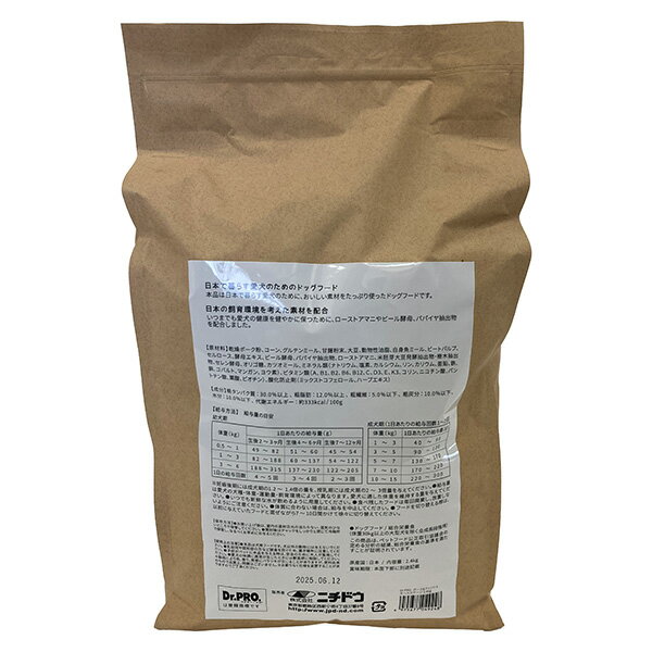 送料無料・同梱可 日本で暮らす愛犬のために開発された、ポーク&フィッシュベースの国産プレミアムドッグフードです。 ポークとフィッシュを主原料にすることでアレルギーにも配慮。 ●原材料 乾燥ポーク粉、コーン、グルテンミール、甘藷粉末、大豆、動物性油脂、白身魚ミール、ビートパルプ、セルロース、酵母エキス、ビール酵母、パパイヤ抽出物、ローストアマニ、米胚芽大豆発酵抽出物・樹木抽出物、セレン酵母、オリゴ糖、カツオミール、ミネラル類(ナトリウム、塩素、カルシウム、リン、カリウム、亜鉛、鉄、銅、コバルト、マンガン、ヨウ素)、ビタミン類(A、B1、B2、B6、B12、C、D3、E、K3、コリン、ニコチン酸、パントテン酸、葉酸、ビオチン)、酸化防止剤(ミックストコフェロール、ハーブエキス) ●保証成分 粗蛋白質30.0%以上、粗脂肪12.0%以上、粗繊維5.0%以下、粗灰分10.0%以下、水分10.0%以下 ●エネルギー 333kcaL/100g ●原産国 日本 ●注意事項 ・本品は犬用のフードです。これ以外の目的には使用しないでください。 ・乳幼児や認知症の方などの誤食を防ぐため、置き場所に注意してください。 ・子供がペットに本品を与える時は、安全のため大人が監視してください。