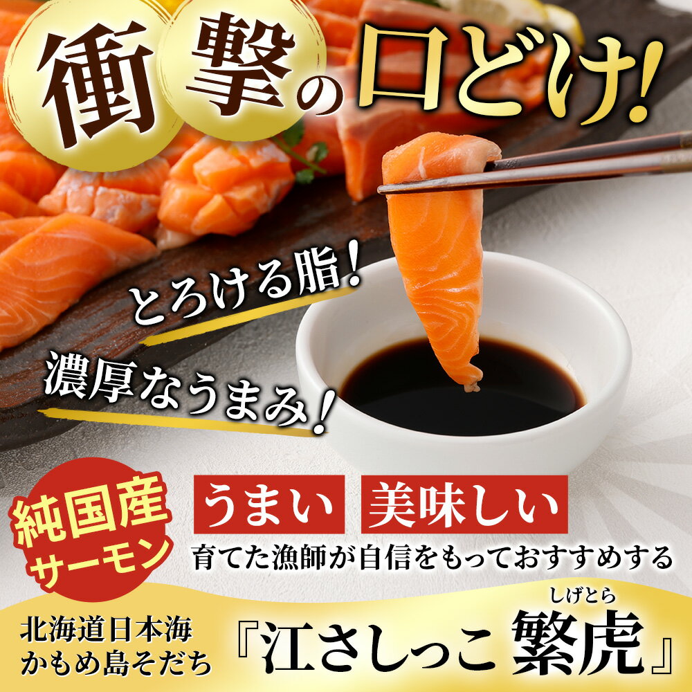 【訳あり】【送料無料】北海道江差産 繁虎サーモン(しげとら) 刺身用トラウトサーモン ブロック 500g / 1000g(カット済) カルパッチョ・炙り・ルイベに! ◆ 訳ありの理由 ◆ 本商品は、100g前後にカットする製造過程で発生する【サイズ未選定(約70~120g)のパック】を集めたお得セットです。 品質・味・鮮度は通常品とまったく同じ!調理の手間がなく、すぐに使えて便利です。 小分けでのお届けなので、必要な分だけ解凍して食べられるのも嬉しいポイント。 ◆ 北海道江差・かもめ島の恵み「繁虎サーモン」 ・北海道の清らかな海で大切に育てた国産トラウトサーモン ・脂のり抜群で、濃厚な旨み ・養殖とは思えないほどの身の締まりと美しい色合い ・刺身・炙り・カルパッチョ・ルイベ・サーモンステーキなど幅広く活用できます ◆ 内容量と仕様 内容:トラウトサーモン カット済みパック(約70~120g/合計500g または 1000g) ※パック数は目安です 500gセット:約5~7パック前後 1000gセット:約10~14パック前後 原料産地:北海道江差町(かもめ島沖) 商品名:繁虎(しげとら)サーモン 保存方法:冷凍(-18℃以下) 賞味期限:商品に記載(目安:出荷日より90日以上) ◆ こんな方におすすめ ・毎日の食卓に手軽にサーモンを取り入れたい方 ・食べ切りサイズの小分けをお探しの方 ・家庭用にも業務用にもまとめ買いしたい方