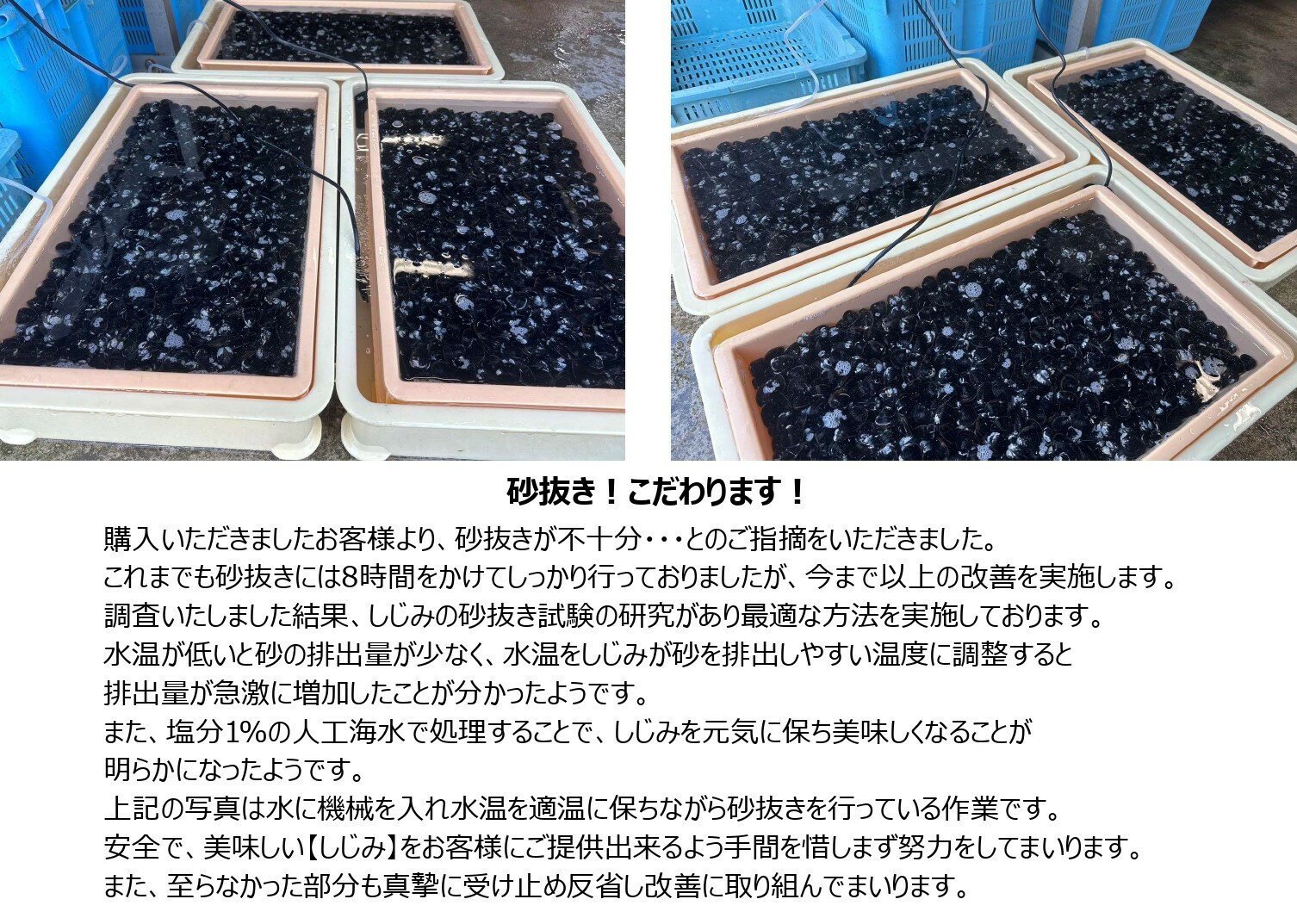 商品情報名称大和しじみ内容量1P:500g又は200g産地名島根県松江市の宍道湖養殖・解凍の別天然の大和しじみです。冷凍で発送いたしますので、軽く水洗い後、そのままご使用下さい。保存方法-18度以下で保存宍道湖 大和しじみ 光輝 Lサイズ 冷凍 砂抜き済 国産 大粒 しじみ 島根 出汁 味噌汁 シジミ お取り寄せ 贈り物 島根県松江市 宍道湖で獲れた新鮮な大和しじみ。砂地で獲っているため、泥臭さなし!漁師さんがこだわって獲られたしじみです。しじみ汁およそ15杯分です。 『いいしじみ獲れたよ~!』りすたむmatsueがご提供するしじみは、漁師の声から生まれます。りすたむmatsueが全国のお客様にお届けする宍道湖東部の大和しじみは、漁師が手間をかけて朝獲りした美しく黒光りしているしじみです!商品は島根・宍道湖産のLサイズの冷凍しじみです☆しじみのサイズは厚みで判断しますが、Lサイズは厚みが14mm以上16mm以下のものになります。宍道湖でも漁場は多くある中で、東部地区の【砂地】のみで獲っているため、色艶が良く泥臭さがありません!漁をする際には出来るだけしじみを傷つけないように心掛け、しじみにストレスを与えないように漁を行い新鮮な状態で砂抜き処理をします。その後、早い段階で冷凍して旨味を閉じ込めるため、【光輝】は【出汁の出かた】に自信があります!手作業で丁寧に選別されていますので、しっかりとしたしじみのみ出荷いたします。※季節や時期によっては、しじみの身の大きさが小さくなることがございます。ご理解いただきますようお願いいたします。※冬場〜春先までの時期は手搔きではなく機械で獲ったしじみになることがあり、多少のキズがある場合もございます。品質、味などには影響しませんのでご安心いただければと思います。ご家庭でも扱いやすい量の、500g又は200gの真空パックにしております。砂抜き済みの冷凍しじみはすぐに使えて、栄養成分大幅アップ♪砂抜きが面倒で調理までの時間を短縮された主婦の方、お酒などがお好きで健康志向の高い方へは、しじみはお薦めですよ♪お中元、お歳暮などの贈り物も受け付けております。〇お召し上がり方しじみ汁しじみお吸い物しじみラーメンしじみパスタしじみご飯しじみ酒蒸し漁師の金津さんの拘りの逸品「光輝」です。是非一度ご賞味ください!※輸送中の衝撃等により真空が崩れることがございますが、品質に問題はございませんので、ご安心いただければと思います。 8