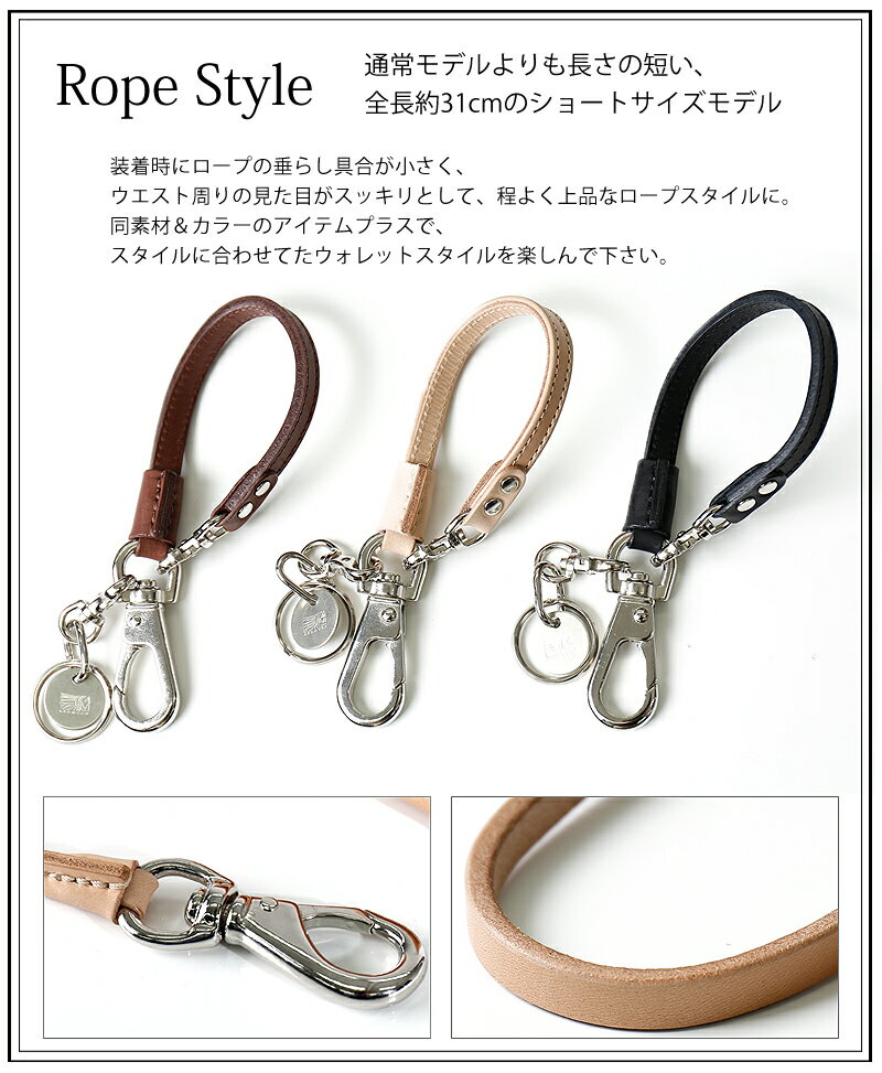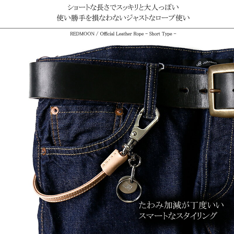 メーカー希望小売価格はメーカーカタログに基づいて掲載しています ※こちらの商品は取り寄せとなりお届けまでお時間頂く場合がございます。 0すっきりとしたロープスタイルを求むユーザー必見 スマート派人気のフラットレザー仕様の「ショート」レンジ モデル ロープスタイルのパイオニアとも言える、 REDMOONブランドのレザーウォレットロープのショートタイプから、 昨今のシンプルめのスタイリングに合わせた、 スッキリと上品なフラットレザーデザインのモデルをご紹介。 全長を、通常モデルよりも短くしながらも、 使い勝手の損なわないジャストサイズと言える約31cmに留め、 装着時にウエスト周りでロープの垂らし加減が程よく、 カジュアルな雰囲気がやや抑えられた上品なロープスタイルとなります。 本体ロープは勿論職人が手仕事で丁寧に編み込む仕様となる、革紐の縁を折込んだ10mm幅の平コードで、 編み込みとは異なるシンプルで大人っぽい雰囲気のロープスタイルを演出します。 カジュアル過ぎない都会的なロープ使いにおすすめです。 レザーブランドとして君臨し、 中でもウォレットアイテムとして定評のあるブランドが専用で作り上げるオフィシャルのウォレットロープ。 着脱可能なサークル型プレートを付属したキーリングも魅力です。 ヒップポケットにウォレットを挿したスタイルで、 ちょうど良いタワみとなり、すっきりしたスタイルを演出してくれます。 是非、妥協ないサイズ選びで、こだわりのウエストスタイルを楽しんでください。 ▼ Recommend Check Item ▼