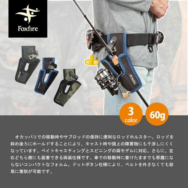 スラントロッドホルスターSlant Rod Holsterオカッパリでの移動時やサブロッドの保持に便利なロッドホルスター。ロッドを斜め後ろにホールドすることにより、キャスト時や頭上の障害物にも干渉しにくく、しゃがんだ際にもグリップエンドが地面に接触しません。ベイトキャスティングとスピニングの両モデルに対応。さらに、左右どちら側にも装着できる両面仕様です。車での移動時に着けたままでも邪魔にならないコンパクトなフォルム。ドットボタン仕様により、ベルトを外さなくても容易に着脱が可能です。●ロッドを斜めにホールド。キャスト時にティップ同士がぶつからない ●右側差し、左側差しの両方対応。ベイトとスピニングの両方対応 ●超コンパクトなフォルム。ドットボタンで簡単に付け外し可能Color:025ブラック・224オリーブカモ・225ネイビーカモSize:■Fabric:ポリエステル ■Weight:60g Foxfireとは 1982年、フォックスファイヤーは4型のフライフィッシングベストからはじまりました。この日本でフライフィッシングのパイオニアとして活動してきた私達の知恵から生まれた作品でした。私達は、そのものづくりの知恵を様々なアイテムに投入し、四半世紀を経て現在の幅広いラインナップを揃えるアウトドアブランドへと発展してきました。その間一貫して取り扱ってきたテーマが「クワイエットスポーツ」です。 クワイエットスポーツとは、その名のとおり、自然の中で騒ぎたてることなく穏やかに楽しむスポーツのこと。フライフィッシングは代表的なクワイエットスポーツのひとつといえます。それは、「自然への挑戦」や「自然の征服」とは異なり、「自然との融和」「自然との共生」をなす知恵から発生しています。そして、それはフォックスファイヤー総てのもの造りの思想やテクノロジーに結びついています。 ※メーカーやモデル等によりサイズ感は異なります。サイズは目安としてお考えください。 ※写真の色と実際の商品の色は多少異なる場合がございます。 ※商品画像はメーカー提供のサンプル画像です。 製品仕様・デザインは改良のため予告なく変更される場合がありますのでご了承ください。 正規品 未使用新品 当店のブランド商品は全て本物です。安心してショッピングをお楽しみください。