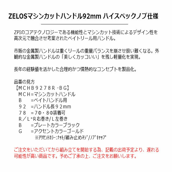 MCHB9278R-BG MCHB9278R-BT MCHB9278R-BGM MCHB9278R-TB MCHB9278R-TG MCHB9278R-TGM MCHB9278R-GMB MCHB9278R-GMG MCHB9278R-GMT MCHB9278L-BG MCHB9278L-BT MCHB9278L-BGM MCHB9278L-TB MCHB9278L-TG MCHB9278L-TGM MCHB9278L-GMB MCHB9278L-GMG MCHB9278L-GMT ZELOSマシンカットハンドル92mm ハイスペックノブ仕様 ZPIのコアテクノロジーである機能性とマシンカット技術によるデザイン性を高次元で融合させ考案されたベイトリール用ハンドル。 市販の金属製ハンドルは重くリールの重量バランスを崩させ扱い難くなる。外観的な金属製ハンドルの「美しくカッコいい」を残し軽量化を実現。 長年の経験値を活かした合理的かつ情熱的なコンセプトを製品化。 品番の見方 【MCHB9278R -BG】 MCH=マシンカットハンドル B =ベイトハンドル用 92 =ハンドル長92mm 78 =7Φ・8Φ装着可 R/L=R右巻き/L左巻き B =プレートカラーブラック G =アクセントカラーゴールド ※アクセントカラー:ナット/緩み止めネジ/ノブキャップ ※受注後より組み立て作業をさせていただく為、発送までに多少のお時間をいただく場合がございますのであらかじめご了承ください。 ※写真の色と実際の商品の色は多少異なる場合がございます。 ※商品画像はメーカー提供のサンプル画像です。 製品仕様・デザインは改良のため予告なく変更される場合がありますのでご了承ください。 正規品 未使用新品 当店のブランド商品は全て本物です。安心してショッピングをお楽しみください。 巻/カラー(プレート×ナット) 右巻き/ブラック×ゴールド 右巻き/ブラック×チタンシルバー 右巻き/ブラック×ガンメタ 右巻き/チタンシルバー×ブラック 右巻き/チタンシルバー×ゴールド 右巻き/チタンシルバー×ガンメタ 右巻き/ガンメタ×ブラック 右巻き/ガンメタ×ゴールド 右巻き/ガンメタ×チタンシルバー 左巻き/ブラック×ゴールド 左巻き/ブラック×チタンシルバー 左巻き/ブラック×ガンメタ 左巻き/チタンシルバー×ブラック 左巻き/チタンシルバー×ゴールド 左巻き/チタンシルバー×ガンメタ 左巻き/ガンメタ×ブラック 左巻き/ガンメタ×ゴールド 左巻き/ガンメタ×チタンシルバー