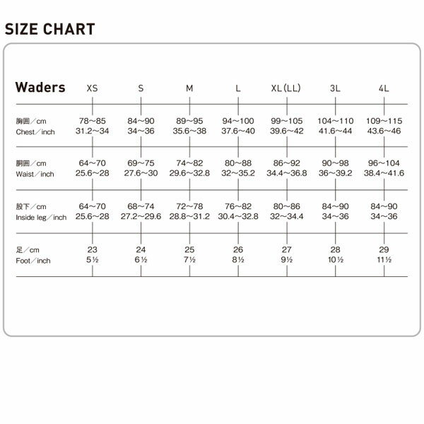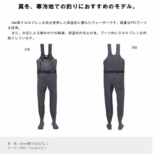 真冬、寒冷地での釣りにおすすめのモデル。ク5mm厚クロロプレン生地を使用した保温性に優れたウェーダーです。軽量なPVCブーツを採用。また、水圧による締め付けの軽減、保温性の向上の為、ブーツ内にクロロプレンを内貼りしています。厳寒期のウェーディングシーバスはもちろん、解禁直後の湖などでのトラウトフィッシングにもオススメです。PVCブーツのソールはオールラウンドフェルトピンタイプ。※弊社のスパイクピンはピンの立ち過ぎによる岩場での滑りを防ぐ為、フェルトと同期して減るアルミピンを採用しております。アルミピンは柔らかい為、初回仕様時にピン頭がフェルトと同じ高さまで減りますが、その後はフェルトの減りに同期して減っていきます。磯靴のように硬いピンをお求めの方にはおすすめ致しません。※フェルトを使用したソールですので積雪や凍った足場での使用の際はご注意ください。※透湿タイプではありませんので寒冷期でも汗による結露の発生で中が湿ります。 本 体:5mm厚クロロプレンブーツ:PVC/フェルトピン ※写真の色と実際の商品の色は多少異なる場合がございます。 ※商品画像はメーカー提供のサンプル画像です。 製品仕様・デザインは改良のため予告なく変更される場合がありますのでご了承ください。 この商品のお支払いはキャッシュレス決済(クレジット決済・ポイント支払い)のみです。 ・キャッシュレス決済(クレジット決済・ポイント支払い)以外をお選び頂いた場合、注文後の変更が出来ないため、ご注文のキャンセル処理をいたします。 ※ご注文後のお客様都合によるキャンセルや変更は承っておりませんので、ご確認の上ご注文をお願いいたします。 正規品 未使用新品 当店のブランド商品は全て本物です。安心してショッピングをお楽しみください。