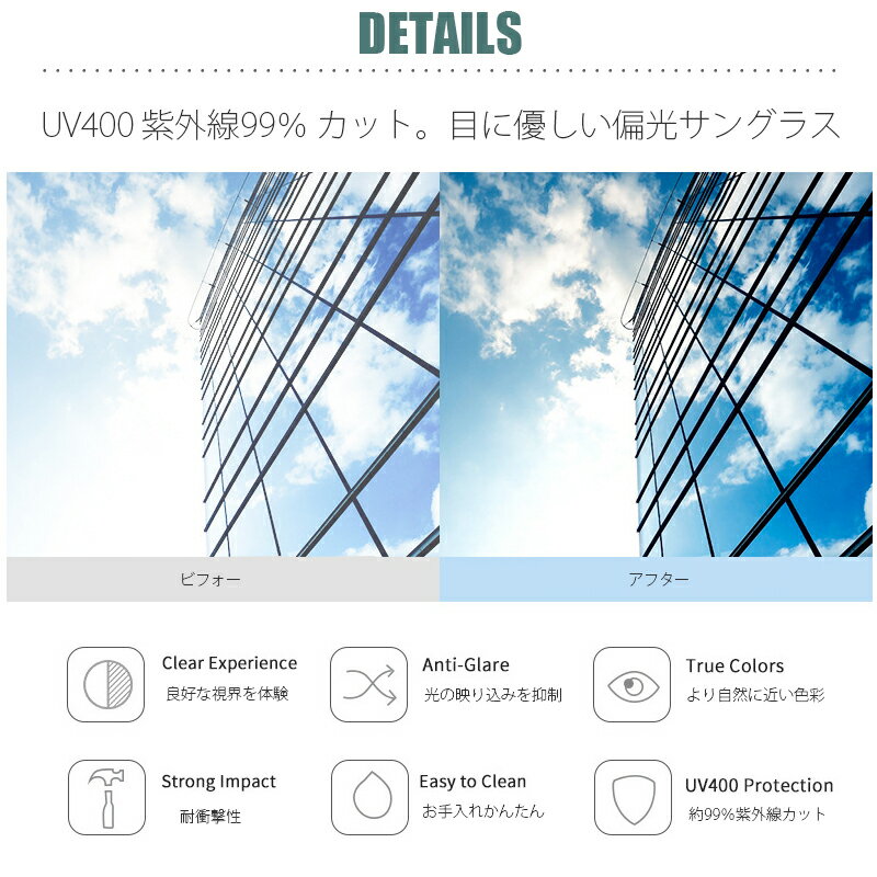 アングラーの必須アイテム。エントリーモデルでありながらも 釣りに適した偏光性能 性能とお求めやすい価格を実現したコストパフォーマンスモデルです。 UV400で紫外線カット率は約99%。 スポーティーでおしゃれなデザインのフィッシング偏光サングラスです。 ■偏光サングラス 釣りにおいて偏光サングラスはロッド・リールと同じくらい重要なアイテムです。 水面のギラツキ(乱反射光)や紫外線などを抑え、見えやすくする事で、水の中の情報が大幅にアップします。 その結果、釣果アップのたくさんの恩恵があります。 また、直射日光や水面からの乱反射から目を守り疲れを軽減します。 スポーツタイプは、外部からの光の差し込みを抑える形状メリットがありますので、 より水の中が見えやすいメリットがあります。 もちろん釣り以外にもドライブ、レジャー、ゴルフ、サイクリング、登山など、スポーツ/レジャー全般でご利用いただけますので汎用性も高いです。 ■よくある質問 偏光レンズのしくみ 偏光レンズはレンズとレンズの間に偏光膜を挟んだものです。 光には縦方向と横方向があります。 反射した光は横方向に振動する光が大半です。 横の光が水面のギラつきの大部分だと思ってください。 偏光レンズはその横の光を大部分カットする機能があり、縦の光だけを通します。 したがって水中に届いた縦波の光だけが魚に届きその光の映像を見ることが出来ます。 (偏光確認カード付属) ■偏光サングラスのおすすめポイント ・水中の魚影を見つけやすくなる。ベイトを見つけやすくなる。 ・地形の変化(ブレイクラインや沈み根など)を見つけやすい。トレースコースをイメージしやすくなる。 ・潮目などの潮流変化が見やすくなる。トレースコースをイメージしやすくなる。 ・ラインの変化をより正確に把握できる。食い上げなど、手に伝わりにくい当たりをラインの情報で察知しやすくなる。 ・波風あって肉眼での水面情報が絶望的な時においても、情報が得られる。 ・物理的な危険の回避。自分の顔にルアーやシンカーが飛んで来た際などに守ってくれる もし見えていたら釣れた魚がいたとしたら絶対にもったいないですよね。 魚影が、ベイトが、ブレイクが、ストラクチャーが、ネストが…等、情報が手に入る事で釣果UPに繋がります。 夜釣りメインの方も、明るい時間帯にポイントチェックしたら釣果アップにつながります。 ■対象魚種・ジャンル・フィールド エギング フライフィッシング ショアジギング アジング ジギング 管釣り キャスティング ウエーディング バスフィッシング サイトフィッシング サーフ ブラックバス チニング シーバス ロックフィッシュ アオリイカ 鮎 アマゴ ヤマメ サーモン 青物 アカハタ オオモンハタ キジハタ ショア 波止 サーフ 地磯 磯 オフショア 渓流 湖 等 ■価格の違いがどこに表れる? 実は偏光性能については数万円でも数千円でも、大きな差はほとんど無いと言われています。 高級レンズはレンズの加工技術レベルや、その工程が多い事から、透明度が高いクリアな視界が確保できます。 「揺れ」や「歪み」が少ない事で、よりフィールドの情報を集めやすく、より疲れにくいとされています。 また、フレームなども同様で、より良い質感を求めると価格が上がります。 まずは5000円くらいまでの偏光サングラスを使ってみて、 その後、当店で取り扱いもあるTALEXの偏光レンズを使用した偏光サングラスにステップアップするのも良いと思います。 ■お手入れについて 永くご愛用いただくためにもメンテナンスは必要です。 レンズを拭くときはレンズ用クリーナーをつけ、メガネクロスで拭きとりしましょう。 汚れがひどい時は、水に濡らしたのち、中性洗剤(台所の食器洗剤)を数滴たらして、指で砂埃・塩分・油分などを落とし、乾かして保管してください。 精密ドライバーが付属していますので、丁番が緩んだ時はゆっくり絞めて調整をしてください。 ※ご注意※ 眼鏡全般に言える事ですが、主に高温・多湿や酸性・アルカリ性洗剤は劣化を引き起こす原因になりますのでお気を付けください。 ・酸性・アルカリ性洗剤は絶対に使わないでください。レンズ表面のコーティングを痛めます(石鹸・ハンドソープ・窓ガラスクリーナーなど) ・水に濡れたままの放置はしないでください。 ・急激な温度差、多湿、55度以上の高温。(例:車内放置など) ■もっとお買い得を目指しました。 グローバル販売向けの商品を直輸入。安価にご提供が可能になりました。 厳重な商品検品、ラベルや商品パッケージ製作など 日本国内販売向けの製造はとてもコストUPに繋がります。 それらを省いて大幅なコストダウンを実現しました。 ■セット内容 商品本体×1 グラスコード×1 偏光レンズ確認カード×1 サングラスケース(ハードケース)×1 クロス(メガネ拭き)× 1 精密ドライバー×1 ※付属品のデザインは製造時期により変更になる場合があります。 商品詳細 ■サイズ(