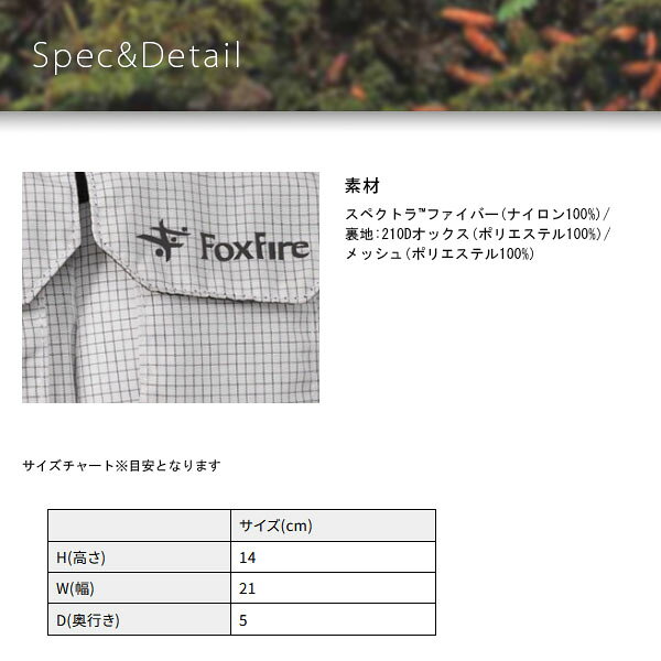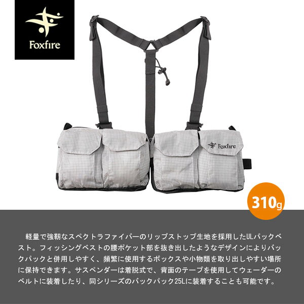 RSライトパックベストRS Light Pack Vest軽量で強靭なスペクトラファイバーのリップストップ生地を採用したULパックベスト。フィッシングベストの腰ポケット部を抜き出したようなデザインによりバックパックと併用しやすく、頻繁に使用するボックスや小物類を取り出しやすい場所に保持できます。サスペンダーは着脱式で、背面のテープを使用してウェーダーのベルトに装着したり、同シリーズのバックパック25Lに装着することも可能です。●軽量で強靭なスペクトラ?ファイバーを格子状に配した生地を採用●フィッシングベスト下側のポケットを抜き出したデザイン●背面に何もないためリュックとの併用が可■サイズ:H14×W21×D5cm■Fabric:スペクトラ?ファイバー(ナイロン100%)/裏地:210Dオックス(ポリエステル100%)/メッシュ(ポリエステル100%)■Weight:310g Foxfire(フォックスファイヤー)とは 1982年、フォックスファイヤーは4型のフライフィッシングベストからはじまりました。この日本でフライフィッシングのパイオニアとして活動してきた私達の知恵から生まれた作品でした。私達は、そのものづくりの知恵を様々なアイテムに投入し、四半世紀を経て現在の幅広いラインナップを揃えるアウトドアブランドへと発展してきました。その間一貫して取り扱ってきたテーマが「クワイエットスポーツ」です。 クワイエットスポーツとは、その名のとおり、自然の中で騒ぎたてることなく穏やかに楽しむスポーツのこと。フライフィッシングは代表的なクワイエットスポーツのひとつといえます。それは、「自然への挑戦」や「自然の征服」とは異なり、「自然との融和」「自然との共生」をなす知恵から発生しています。そして、それはフォックスファイヤー総てのもの造りの思想やテクノロジーに結びついています。 ※メーカーやモデル等によりサイズ感は異なります。サイズは目安としてお考えください。 ※写真の色と実際の商品の色は多少異なる場合がございます。 ※商品画像はメーカー提供のサンプル画像です。 製品仕様・デザインは改良のため予告なく変更される場合がありますのでご了承ください。 正規品 未使用新品 当店のブランド商品は全て本物です。安心してショッピングをお楽しみください。