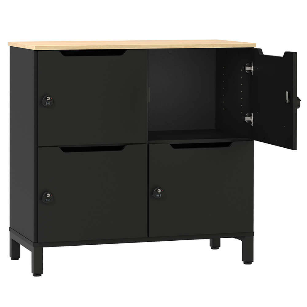 【商品説明】ソリード パーソナルロッカーは、フリーアドレスのワークスペースに最適な木製ロッカー(4人用)です。高さはハイカウンター同等のH1000mmで、スモールオフィスにも圧迫感なく設置できます。 *各ロッカー内寸はW471*D438*H403mmと大容量で手荷物から書類まで豊富に収納できます。内部には別売オプション棚板の追加も可能。取り付け位置は7段階から選べ用途に応じて調整できます。 *扉には3桁のダイヤル錠を装備。鍵を持たずに施錠・解錠でき、セキュリティ管理が容易です。番号を忘れた場合は暗証番号検索キーで対応できます。扉上部にはスリットがあり、開閉や書類の受け渡し等に利用できます。 *天板は配線切り欠き付きで壁付けや背合わせレイアウトにも対応。背面は本体同色の化粧仕上げで独立使用が可能なため、間仕切りとしてもご利用いただけます。 *丈夫なスチール脚部付きで掃除がしやすく、掃除ロボットの使用にも対応しています。耐荷重:天板約30、棚板約10、底板約30*組み立て式(2人以上で約45分)要プラスドライバー、スパナ付属 【商品仕様】ID code (商品番号) : RFPL-22BK-BKD material (素材) : 本体:低圧メラミン化粧木質ボード、PVCエッジ / 脚部:スチール(粉体塗装)/アジャスター:PP size (サイズ) : W1000xD525(鍵含む)xH1000/内寸:W471xD438xH403mm weight(重量): 約55Kg color (カラー) : 本体・扉:ブラックB/天板:オークA place of production (生産国) : 中国