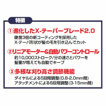 品番:ER-GP82-K(黒) (ER-GP80後継機種) 電源方式:充電・交流式 充電時間:約1時間 コードレス使用時の連続使用可能時間:1回の充電で約50分 本体寸法:高さ17.6×幅4.7×奥行4.8cm 本体質量:約245g 電源コードの長さ:3m 電圧:AC100-240V(50-60Hz) 消費電力:約9W(AC100V交流式使用時)、約10W(AC100V充電時) 生産国:本体-日本 アタッチメントコーム3個(3mm/4mm, 6mm/9mm, 12mm・15mm) 別売り替刃ER9920
