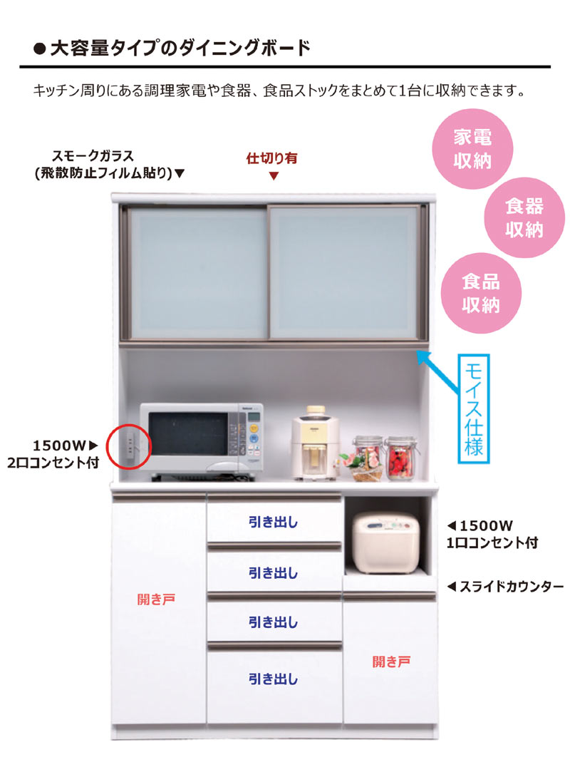 食器棚 引き戸 白 120cm キッチンボード レンジ台 スライド オープン ダイニングボード レンジボード キッチン 収納 引き出し ストッカー キッチン収納棚 ホワイト ブラウン 光沢 艶 木目調 大容量 コンセント MOISS おしゃれ 清潔感 カジュアル シンプル 日本製 大川家具