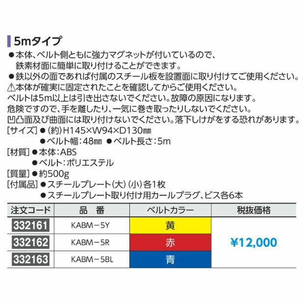 【品番とベルトカラー】 ●332161(KABM-5Y):黄 ●332162(KABM-5R):赤 ●332163(KABM-5BL):青