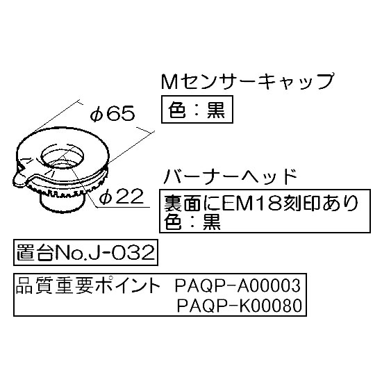 バーナーの上にセットをする、炎が出る部分のキャップです。 <色>黒 <サイズ>直径65×内径22(mm) ※裏面に「EM18」刻印あり ※刻印の「?」(ハイフン)以降の数字は製造番号の為、ハイフン以降の数字がお手持ちの部品と異なる場合でも対応する部品です。 <対応型番一覧> 【RHS21W4D8V2-SR】【RHS21W4D8V2-SL】【RBC4WNGN36-L(B)】【RBC4WNGN36-R(B)】【RBC4WNGN37-L(B)】【RBC4WNGN37-R(B)】【RBC4WNGN39-L(B)】【RBC4WNGN39-R(B)】【R3G735B1L1V】【RR71WG1RSL】【RHS71W10G9V-BL】【RHS71W10G9V-BR】【RHS71W10G11R-BL】【RHS71W10G11R-BR】【RHS31W10G11R-BL】【RHS31W10G11R-BR】【RB71WG1RSL】【RB31WG1RSL】【RRB71W10G11R-SL】【RRB31W10G11R-SL】 ※交換部品は必ず商品検索で製品本体型番をご確認の上ご購入下さい。