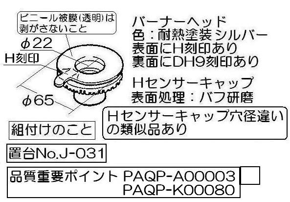 バーナーの上にセットをする、炎が出る部分のキャップです。 <色>シルバー <サイズ>直径65×内径22(mm) ※表面に「H」、裏面に「DH9」刻印あり ※刻印の「?」(ハイフン)以降の数字は製造番号の為、ハイフン以降の数字がお手持ちの部品と異なる場合でも対応する部品です。 <対応型番一覧> 【RB38W6K8SWR】【RD311G10S】【RD311G10S3】【RD311G10S3A】【RD311G10S2V】【KRMG173HRSSL】【R3G735C1L7T】【R3G735C1R7T】【RBC4WNGN36-L(STCG)】【RBC4WNGN36-R(STCG)】【RBC4WNGN36-L(STCM)】【RBC4WNGN36-R(STCM)】【RBC4WNGN37-L(STCG)】【RBC4WNGN37-R(STCG)】【RBC4WNGN37-L(STCM)】【RBC4WNGN37-R(STCM)】【RB31WG7RSL】【RB71WG7RSL】【RBC4WNGN39-L(STCG)】【RBC4WNGN39-R(STCG)】【RR7W10G7RSL】【RRB71W10G7R-SR】【RRB71WG5RSL】【RHS71W10G7V-SL】【RHS71W10G7V-SR】【RHS71W10G12R-SL】【RHS71W10G12R-SR】【RHS71W10G7R-SL】【RHS71W10G7R-SR】【RHS31W10G12R-SL】【RHS31W10G12R-SR】【RHS31W10G7R-SL】【RHS31W10G7R-SR】【RHS71W10G12V-SL】【RHS71W10G12V-SR】【RRB71W10G7V-SL】【RRB71W10G7V-SR】【RRB71W10G7R-SL】【RRB71W10G12R-SL】【RRB31W10G7R-SL】【RRB31W10G12R-SL】 ※交換部品は必ず商品検索で製品本体型番をご確認の上ご購入下さい。