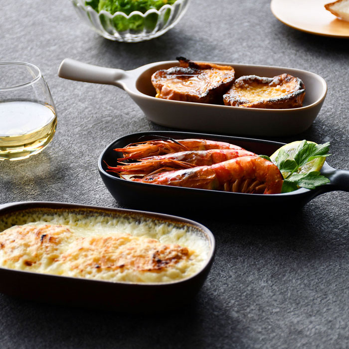 当店人気のグリル用グラタン皿にハンドル付の新タイプが登場! 耐熱温度500℃で日本製、コンロの魚焼きグリルで安心して使えるグラタン皿。 1個で、1人分がちょうどよく入るサイズです。 オーブンや電子レンジ、トースターにも対応します。 「ブラック」は、ややグレイがかった柔らかな黒色。 「ライトグレイ」は、ベージュのニュアンスがある、あたたかなグレイ色。 「ブラウン」は、定番で使いやすいカジュアルな茶色。 シックなカラーバリエーションで、日常使いしやすく長くお使いいただけます。 創業30年以上の新潟県三条市のテーブルウェアメーカー「クリヤマ」とのコラボ商品、Rinnai Styleのみの限定販売です。 【素材】耐熱陶器 【耐熱温度】500℃ 【サイズ】W10×D26.5×H4.5(cm) 【重量】360g 【容量】360cc 【原産国】日本 【付属品】レシピ(7品) 【注意】 ・魚焼きグリル、オーブントースター、オーブン、電子レンジでの調理器具としてお使いいただけます。上記以外の熱源では使わないでください。 ・揚げ物調理には絶対使用しないでください。 ・調理中、直後のお皿は大変熱くなっております。必ず耐熱性の高いミトンなどでお持ちください。 ・食器洗い乾燥機では使用しないでください。 ・グリルによっては皿が入らない場合がございます。サイズをよくご確認の上、ご購入ください。 ・縁などに見られる茶色の部分は、焼成の変化によるもので、ご使用上問題ありません。 ・サイトの写真と実物の商品では、色や質感が異なる場合があります。 ・コルクマットは付属しておりません。 ※この商品は製造元から直接出荷される商品の為、他の商品とは別配送となります。 (製造元)株式会社クリヤマ ※土日祝日および弊社指定休業日前後のご注文については発送に時間が掛かる場合がございますので、ご了承ください。 ☆人気のグリル専用ミトン →グリルミトンミニ(ベージュ×ブラウン)はこちら →グリルミトンミニ(グレイ×ブラック)はこちら