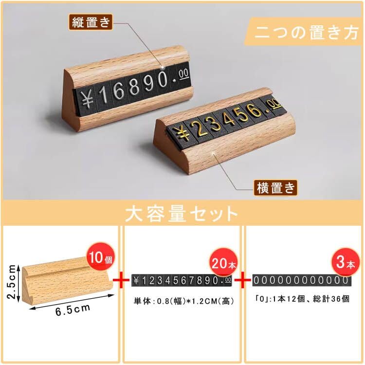 ブナ材/銀文字,台座10個セット/-/-・Color:ブナ材/銀文字,台座10個セット・大容量セット底座10個+プライス数字プレート「\・1・2・3・4・5・6・7・8・9・0・00」 x 20本+「0」数字プレート3本1本12個、総計36個 。一番よく使う「0」の札が3本総計36個付属し、とても便利です。・製品詳細底座:黒胡桃材/ブナ材、6.5cm 幅× 2.5cm高。プライス数字プレート:ABSプラスチック、単体:0.8幅*1.2CM高。・値札表示をおしゃれに美しい黒胡桃材/ブナ材の台座、高級品から雑貨まで様々な商品の価格表示に適しており、見た目も上品な印象を与えてくれます。木材は天然の材質を使用しているため色味・木目が1つ1つ異なります。・万の値まで表示可能 面倒な操作は不要で、数字プレートを縦にスライドさせて数字を組み替えるだけでご希望の 価 格 表示を自由に変更でき、万単位まで表示できます。・使用シーンその場で金額を変更できる手軽さと高額の価格表示も可能なため、パン屋や雑貨屋、フリマサイトの撮影用、高級宝