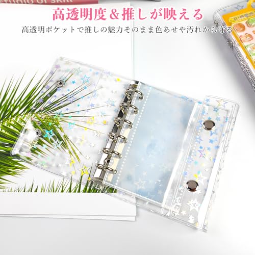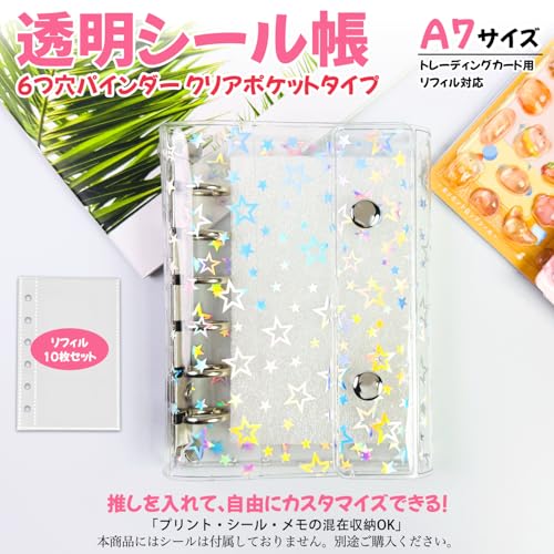 星柄入りカバー/-/-・Color:星柄入りカバー・キラキラ輝く“見せる”シール帳ホログラム風の星柄を散りばめた透明バインダーは、角度によってキラッと輝き、シールの可愛さをさらに引き立ててくれます。収納するだけでなく、見た目も楽しめる“映えアイテム”。お気に入りを飾って、自分だけの特別な一冊を作ってみよう・使いやすいA7サイズ&6穴バインダー手のひらに収まるA7(ミニ6)サイズで、持ち運びラクラク。小さなバッグにもすっぽり入るから、通学やお出かけのお供にもぴったり。6穴式でリフィルの入れ替えも簡単、自分好みにカスタマイズ・すぐ使える透明スリーブ10枚付き初めての方でも安心の、透明リフィル10枚入り。大切なシールを綺麗に保管しつつ、出し入れもスムーズ。シール帳サイズ:14.5cm x 11cm x 2.3cm リフィルサイズ:8.6cm x 13cm・軽くて丈夫なPVC素材柔らかくて耐水性のあるPVC素材を採用。雨の日やバッグの中でも汚れにくく、毎日持ち歩いても安心。しっかり留まるボタン付きで、移動中に勝手に開く心配もありません・アレンジ自在で使
