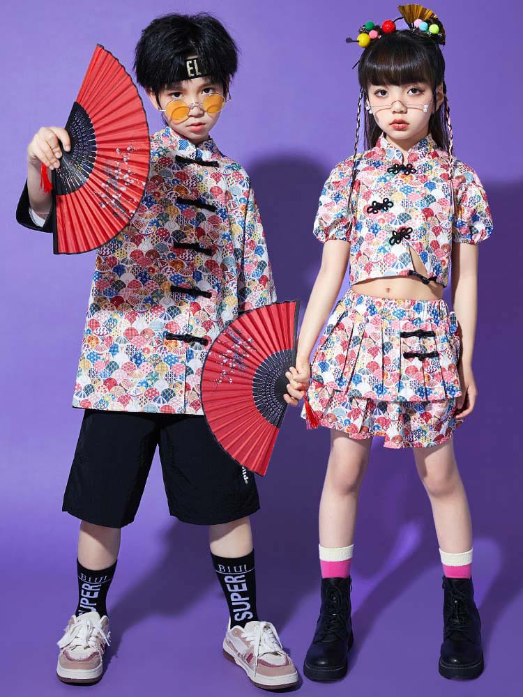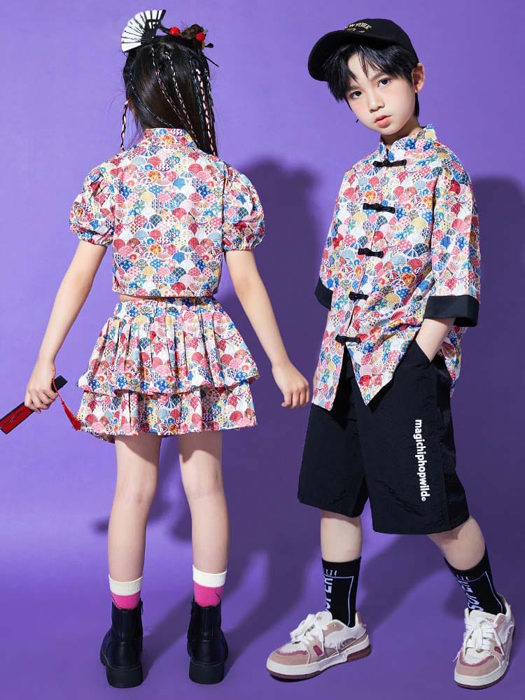 上下セット 和風 結び釦 スカート 捺染 チャイナ風 中華風 ピンク 桜色 マルチカラー へそ出し キッズダンス衣装 セットアップ ヒップホップ ストリート 子供服 男の子 女の子 シャツ パンツ ボタン 襟元 半袖 ハーフ 流行 ストリートダンス おしゃれ